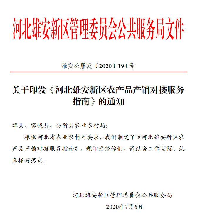 近期,受新冠肺炎疫情影响,部分农产品出现滞销问题。为做好疫情防控期间产销对接工作,结合雄安新区实际,雄安新区公共服务局印发了《河北雄安新区农产品产销对接服务指南》,统计了农业生产龙头企业、生产经营主体名录,销售方面的批发市场、商场超市名录等,为农产品搭建起销售桥梁,加强产销对接,让“菜园子”直通“菜篮子”,实现供需双赢。