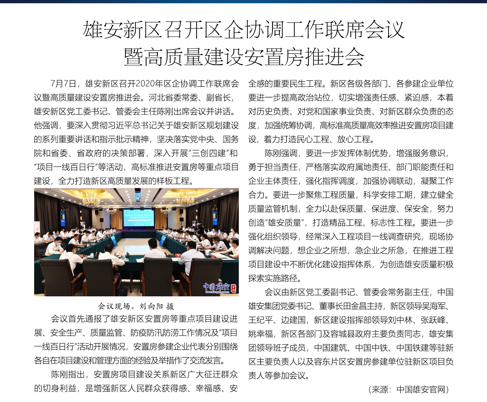 雄安新区召开区企协调工作联席会议暨高质量建设安置房推进会