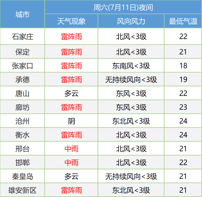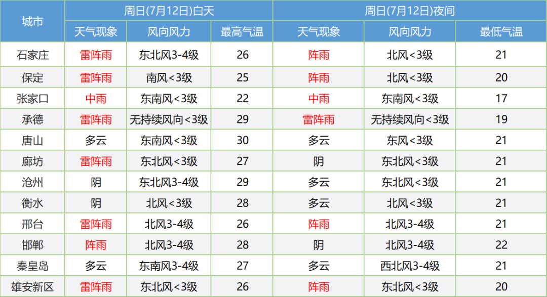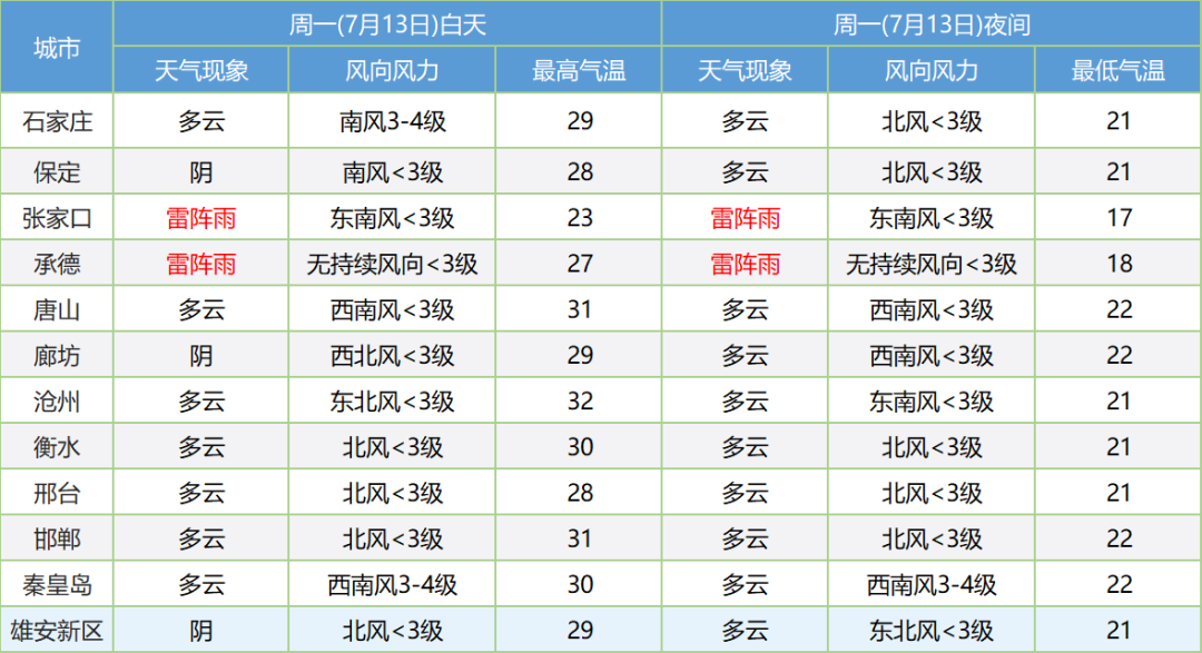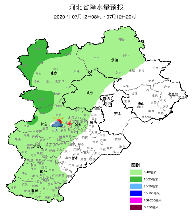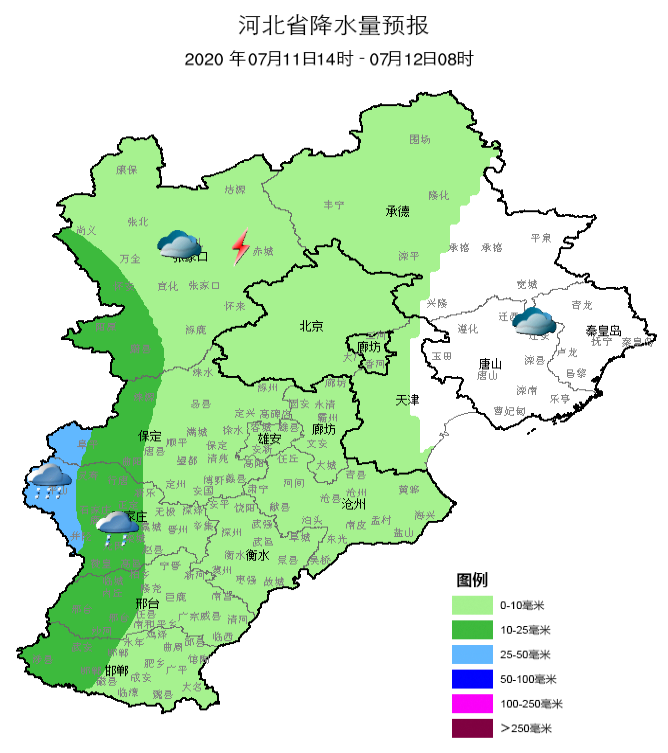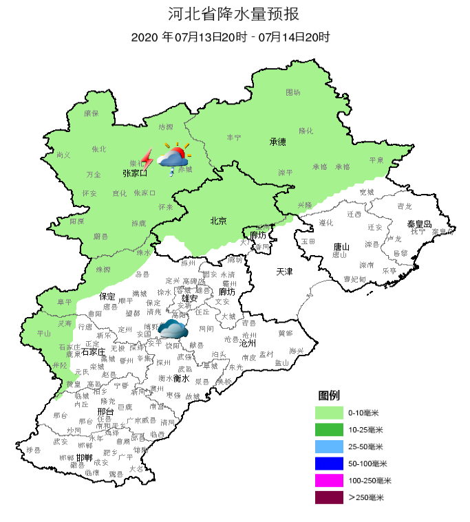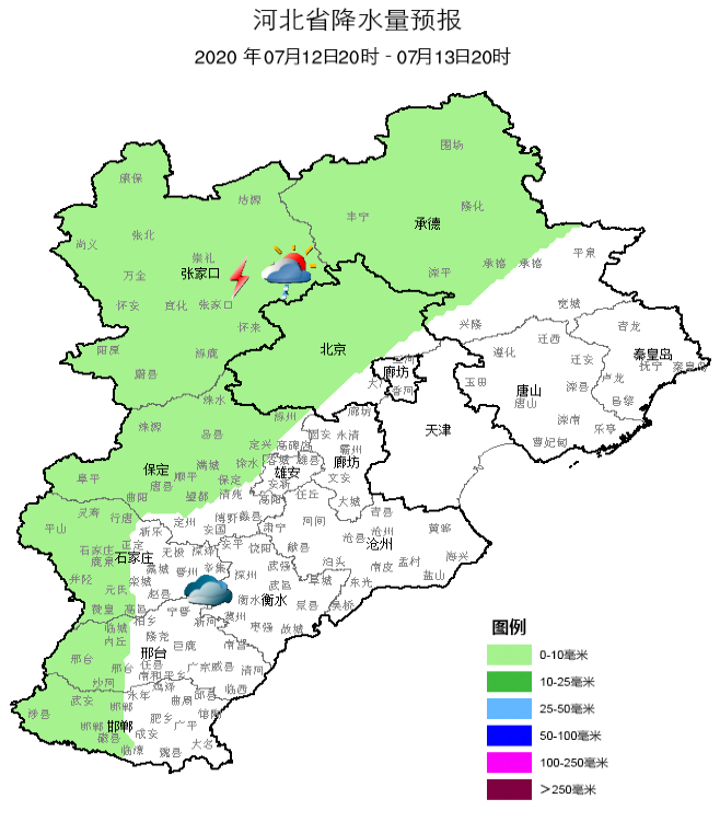 明天白天,全省阴,张家口、承德西部、保定、雄安新区、石家庄、邢台、邯郸有雷阵雨或阵雨,其中张家口、保定西部局地有中到大雨。