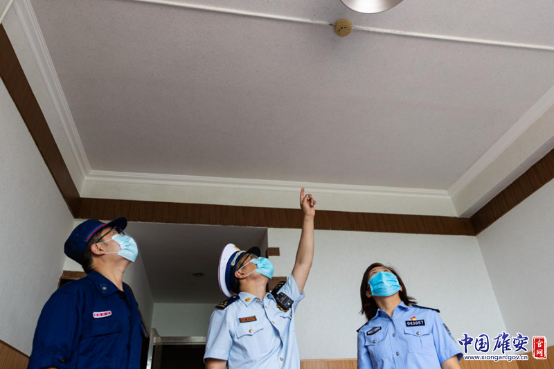 消防救援大队执法人员对考生食宿场所感烟探测器进行检查。中国雄安官网记者高盟 摄