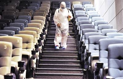 7月19日,邯郸市丛台区一家影院的工作人员对放映厅进行消毒,为恢复开放营业作准备。 新华社发(郝群英 摄)