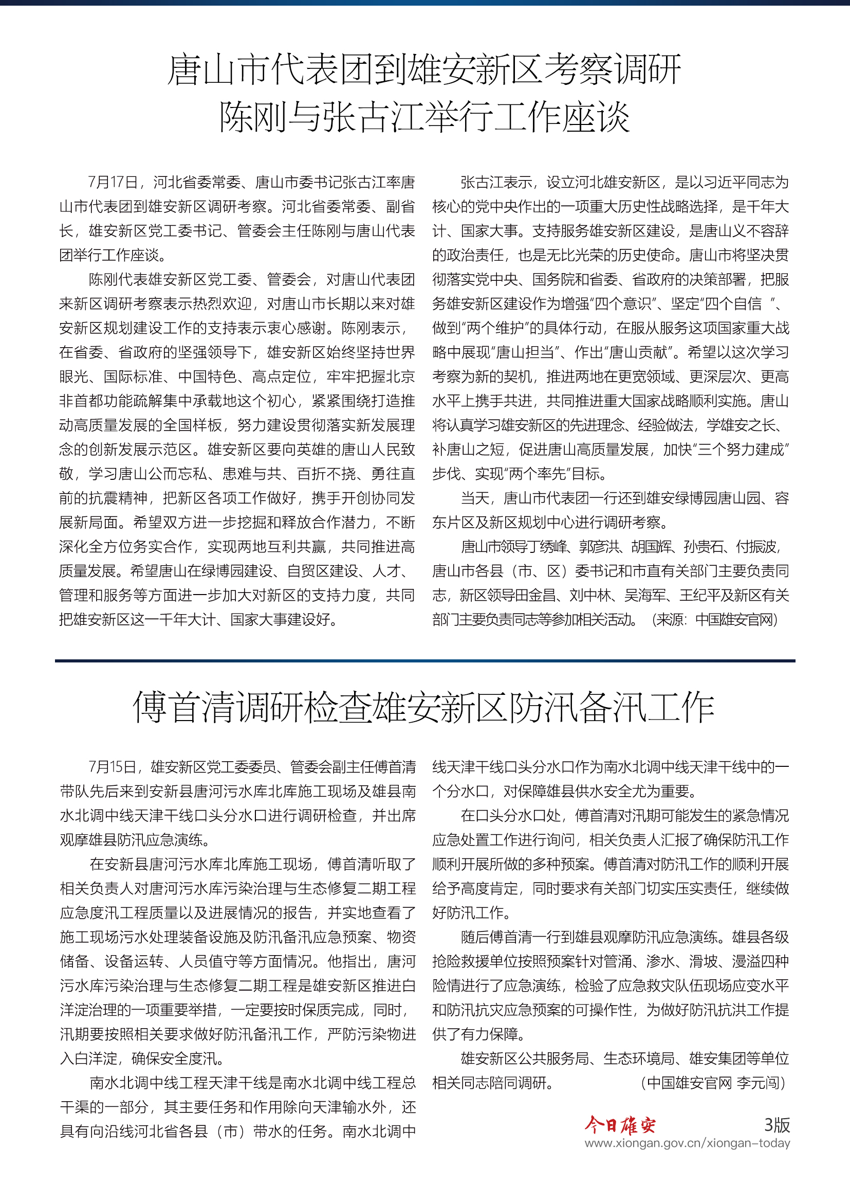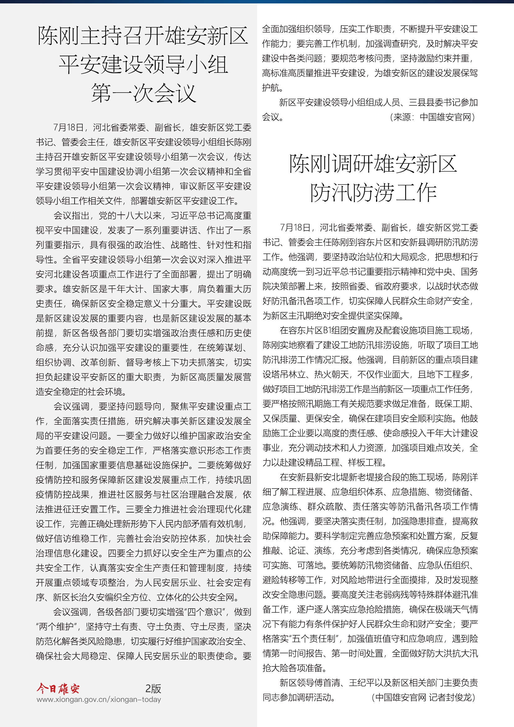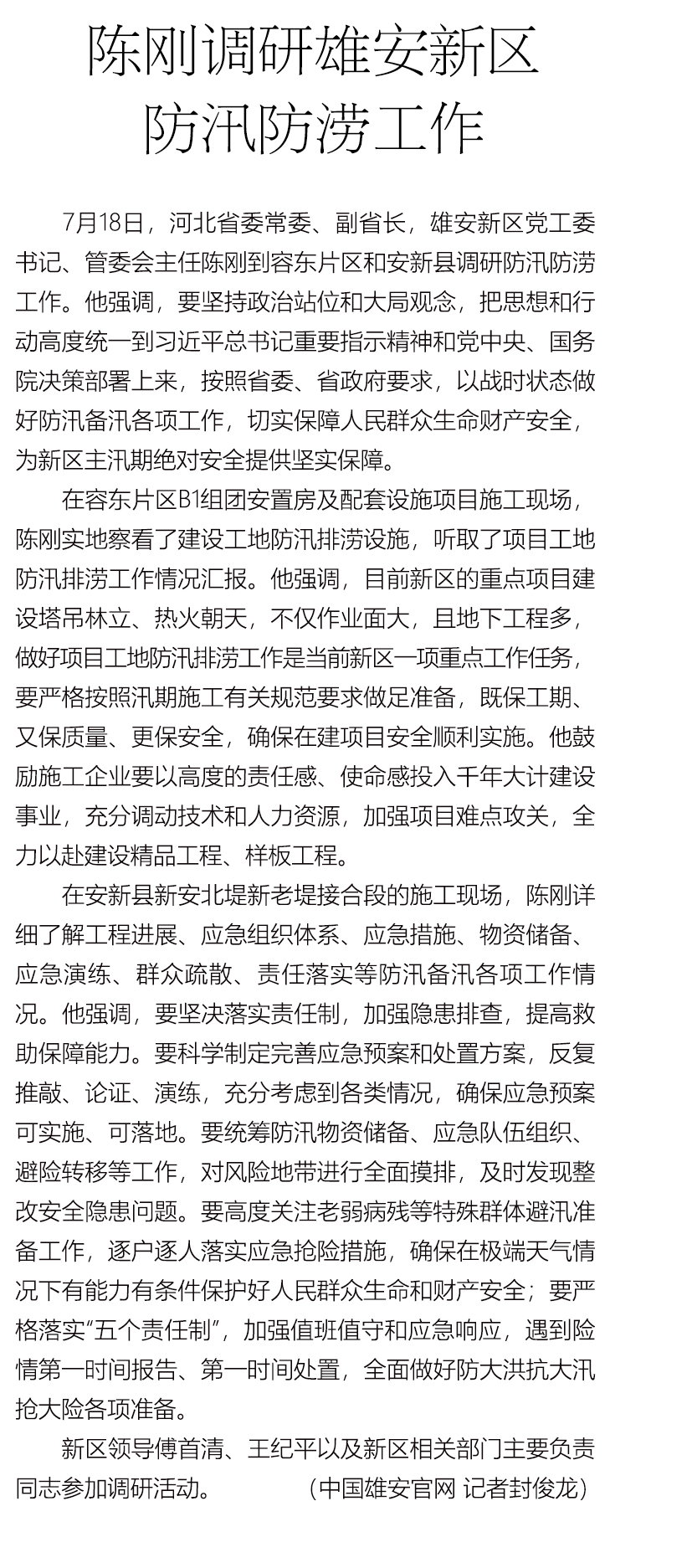 7月18日,河北省委常委、副省长,雄安新区党工委书记、管委会主任陈刚到容东片区和安新县调研防汛防涝工作。