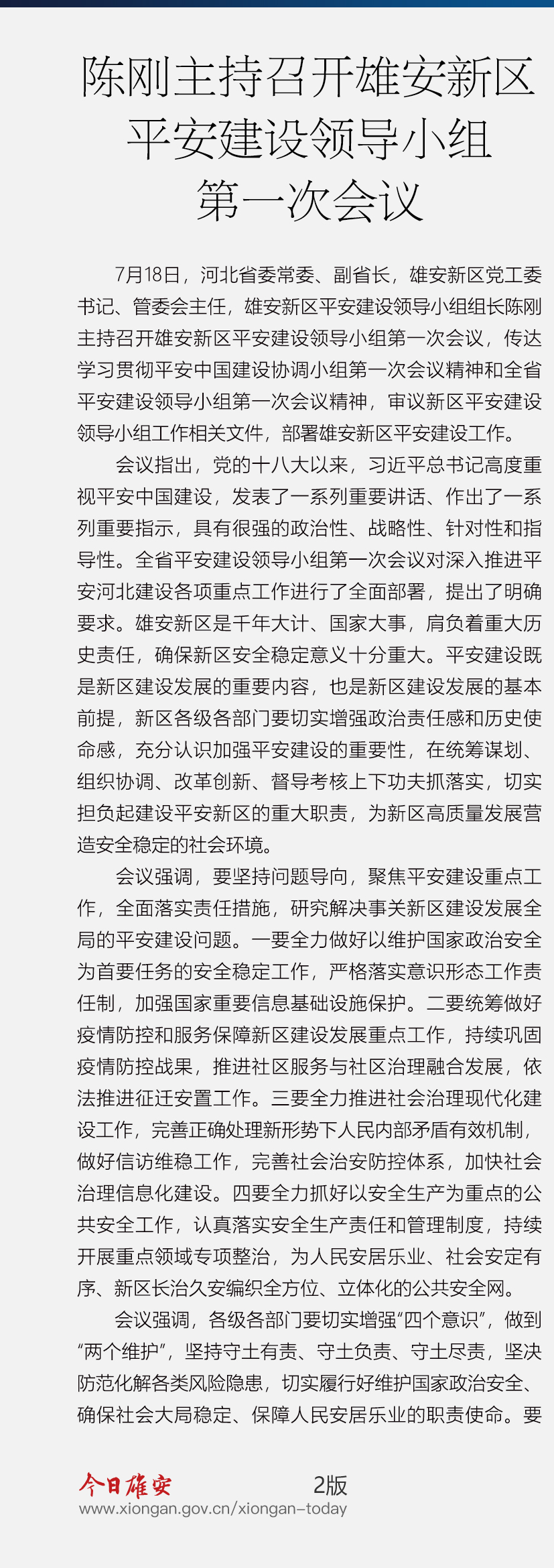 陈刚主持召开雄安新区平安建设领导小组第一次会议