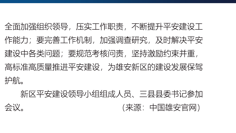 审议新区平安建设领导小组工作相关文件,部署雄安新区平安建设工作。