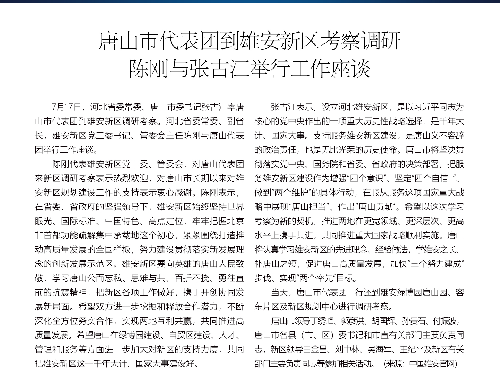 唐山市代表团到雄安新区考察调研 陈刚与张古江举行工作座谈