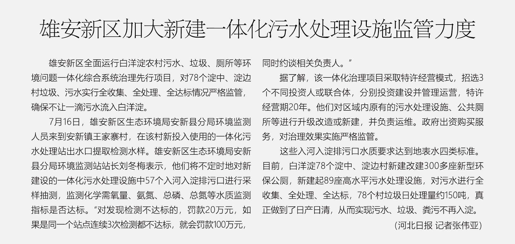 雄安新区加大新建一体化污水处理设施监管力度