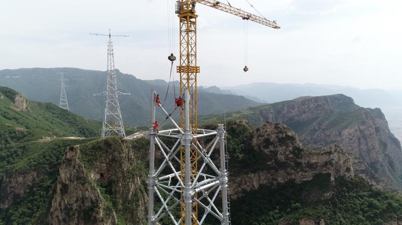 工程全线山区、丘陵地形占比近70%,现场交通运输困难、施工难度高,加之张家口地区冬长夏短,冬季寒冷多风导致部分区域有效工期不足6个月,高峰期同时在场施工人数近3000人。建设过程中线路成功跨越位于张家口市蔚县的太行山脉,在悬崖地形无法设置外拉线的环境下,成功完成距离780米,高差500米,山上山下两基塔位的建设任务。工程多次跨越500千伏线路、铁路、高铁、高速公路、长城遗址等高风险作业点,其中,工程二标段在3.2公里的放线区段,同时跨越唐呼铁路、500千伏线路、220千伏线路、通信线路,共计跨越30处,跨越过程中建设的40.5米盘扣式跨越架高度打破国网冀北电力跨越架高度历史记录。