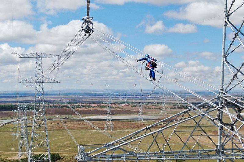 2020年5月29日,国网冀北电力北京送变电公司施工人员在张北-雄安1000千伏特高压输电线路工程进行附件安装。(李峥)