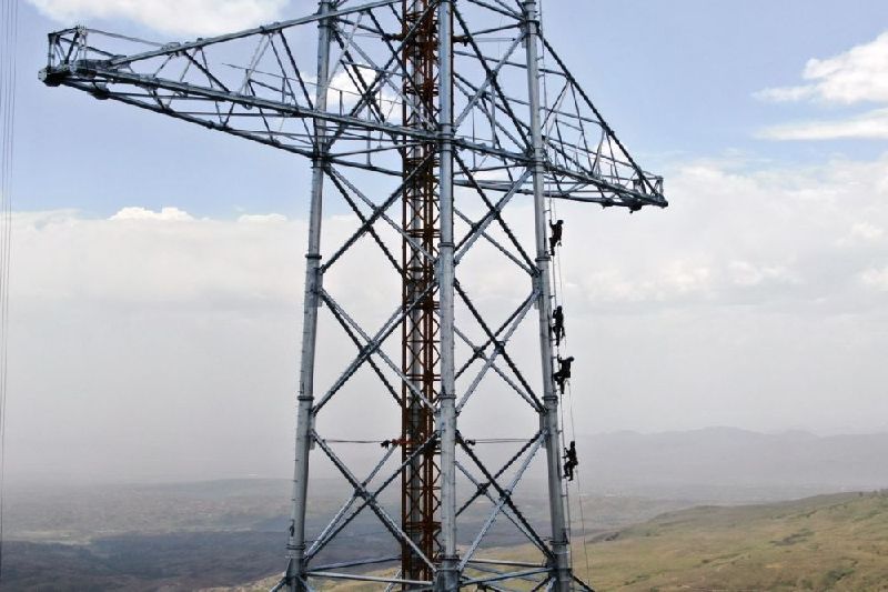 2020年5月28日,国网冀北电力北京送变电公司施工人员在张北-雄安1000千伏特高压输电线路工程排队上塔准备进行铁塔组立。(李峥)