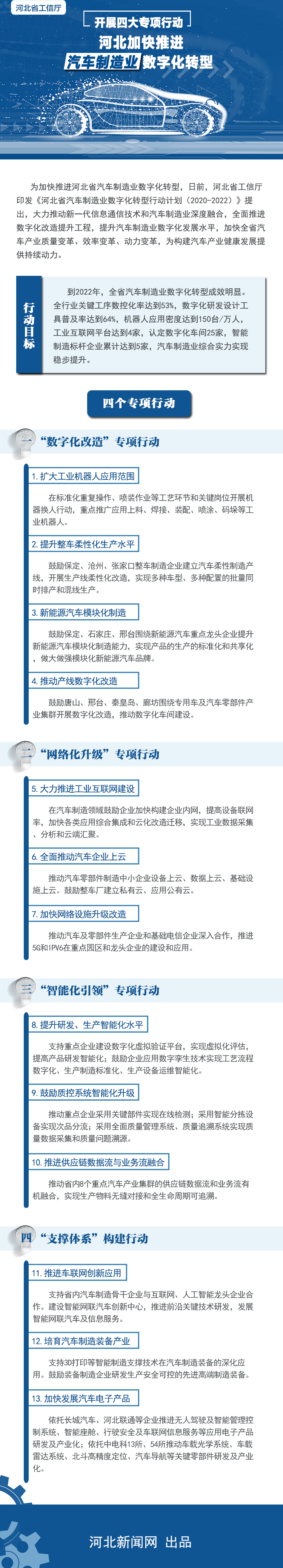 为加快推进河北省汽车制造业数字化转型,日前,河北省工信厅印发《河北省汽车制造业数字化转型行动计划(2020-2022)》提出,大力推动新一代信息通信技术和汽车制造业深度融合,全面推进数字化改造提升工程,提升汽车制造业数字化发展水平,加快全省汽车产业质量变革、效率变革、动力变革,为构建汽车产业健康发展提供持续动力。