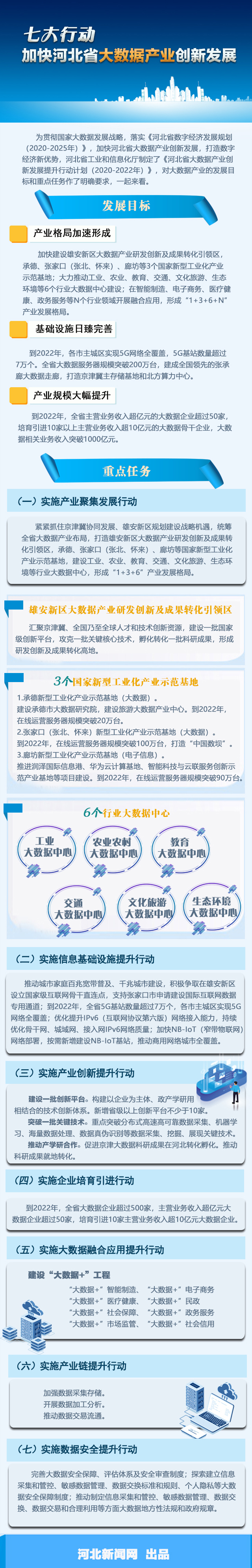 为贯彻国家大数据发展战略,落实《河北省数字经济发展规划(2020-2025年)》,加快河北省大数据产业创新发展,打造数字经济新优势,河北省工业和信息化厅制定了《河北省大数据产业创新发展提升行动计划(2020-2022年)》,对大数据产业的发展目标和重点任务作了明确要求,一起来看。