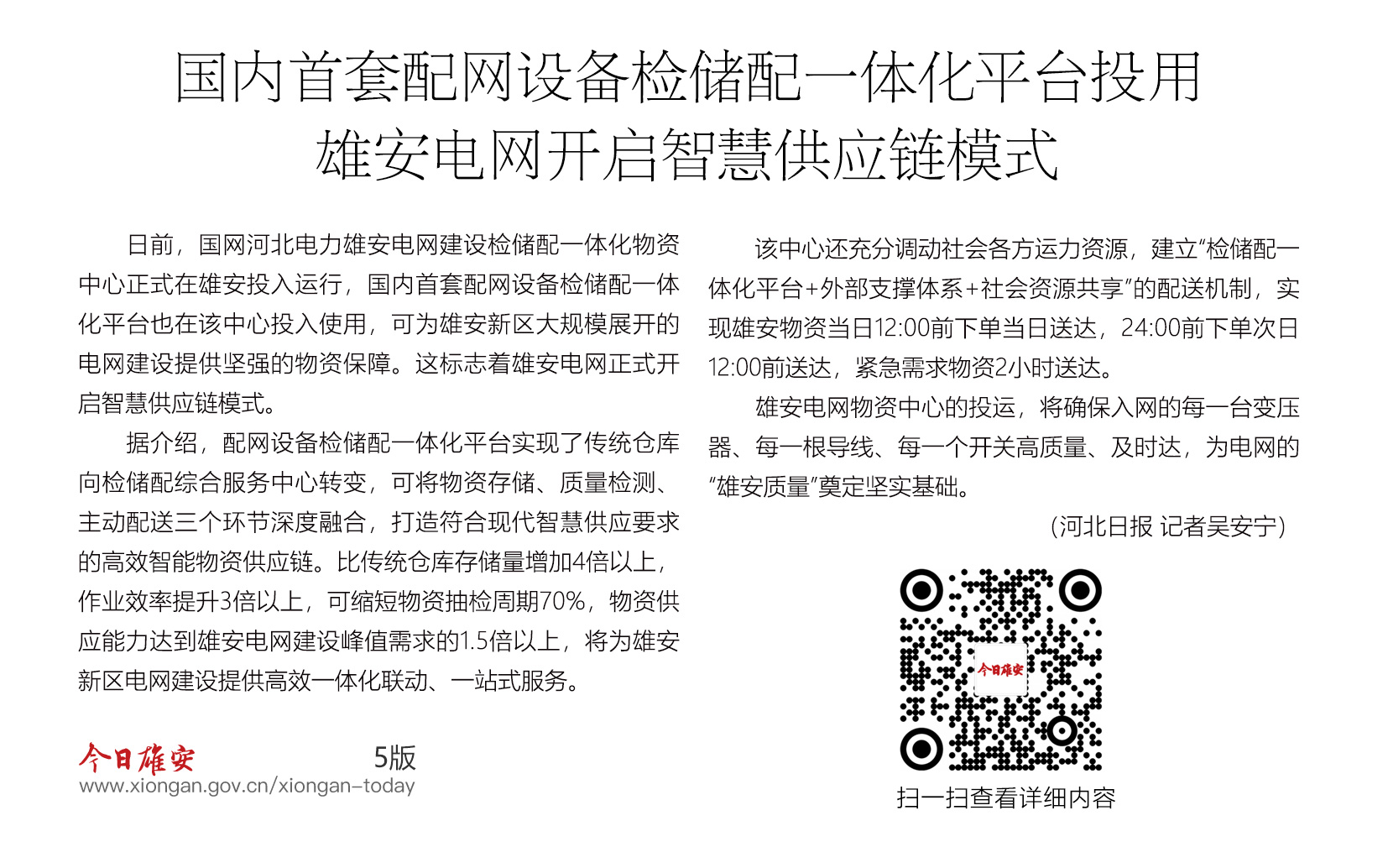 国内首套配网设备检储配一体化平台投用 雄安电网开启智慧供应链模式
