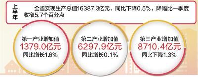 经济持续恢复向好。上半年,全省规模以上工业增加值同比增长0.8%,比一季度回升5.6个百分点,今年以来累计增速首次实现增长。其中,6月份增长3.7%,已连续4个月保持增长。在统计的40个行业大类中,有30个行业生产比1至5月份好转,占75%。制造业增加值同比增长0.9%,继续引领工业复苏。此外,部分服务业行业实现较快增长。上半年,信息传输软件和信息技术服务业增加值同比增长12.7%,金融业同比增长6.5%,教育业同比增长6.1%,房地产业同比增长4.9%。