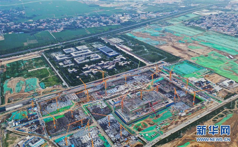 7月24日拍摄的雄安商务服务中心会展中心施工现场(无人机照片)。 新华社记者 邢广利 摄