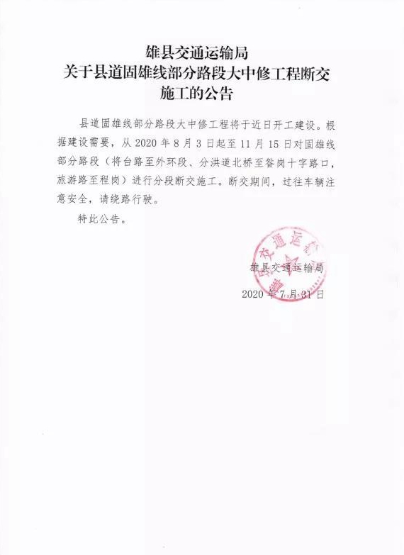 关于雄县道固雄线部分路段大中修工程断交施工的公告