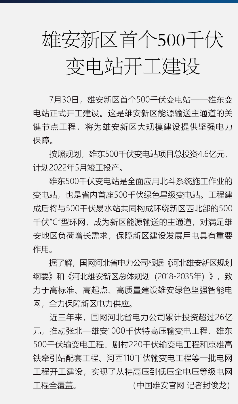 雄安新区首个500千伏变电站开工建设