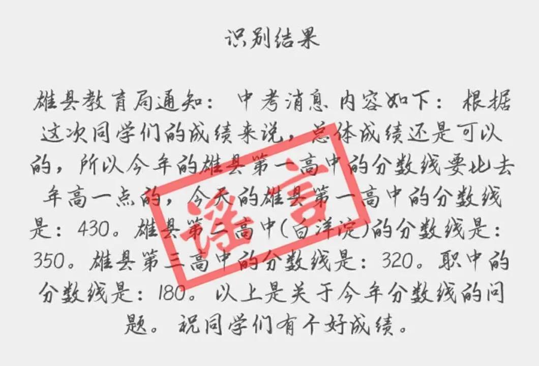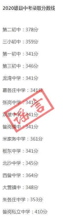 目前,雄县教育局尚未发布任何关于2020中考录取信息,所有关于第一高级中学、第二高级中学、第三高级中学和雄县职教中心录取分数线的信息均为虚假信息,请大家不要轻信,同时不要转发传播。我县各高中学校录取信息将在第一时间通过教育局发布并由就读学校及时通知全体考生,敬请大家关注。所有信息均以雄县教育局官方通知公告为准。如蓄意制造、传播虚假信息,有关部门将予以严肃查处。