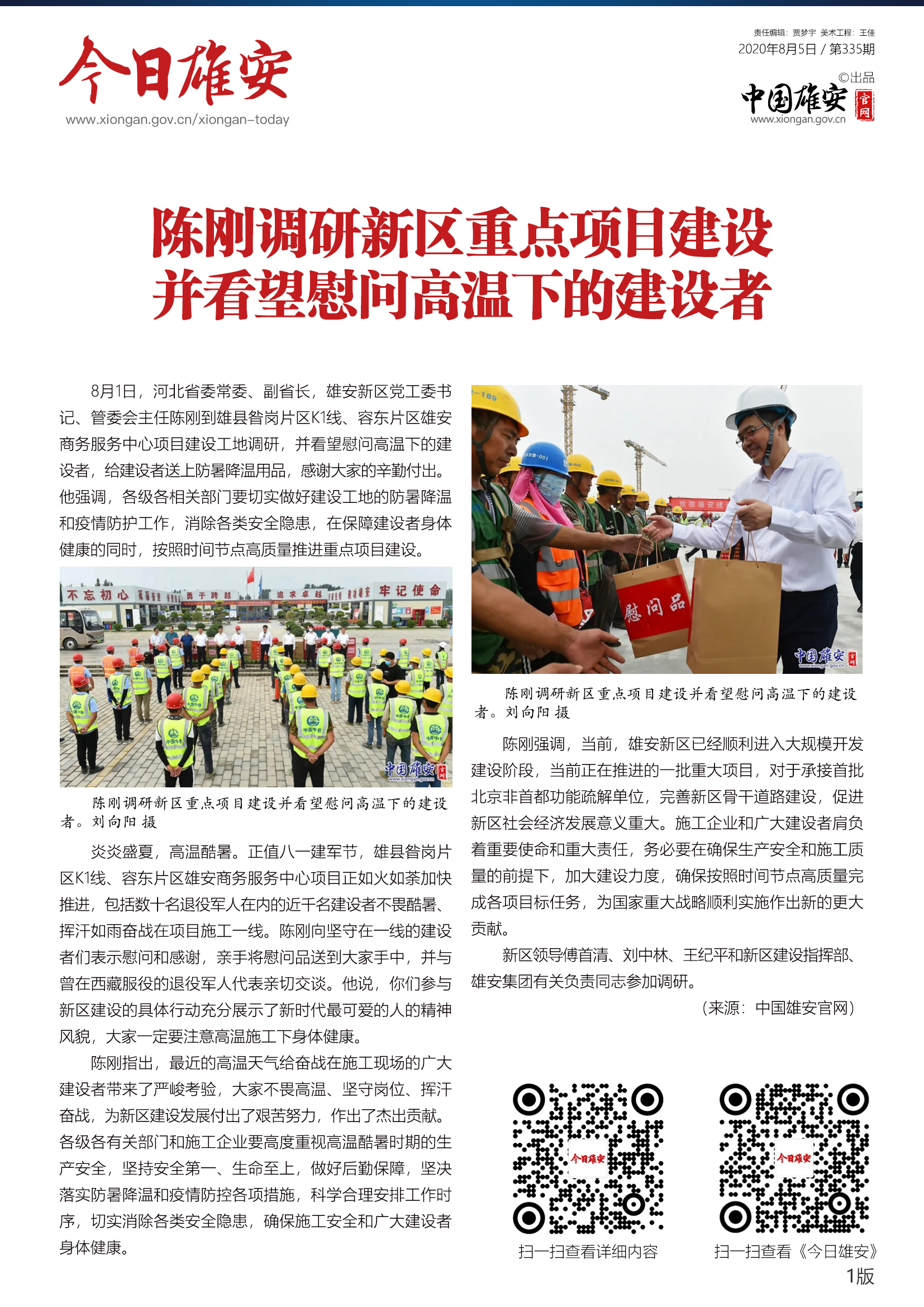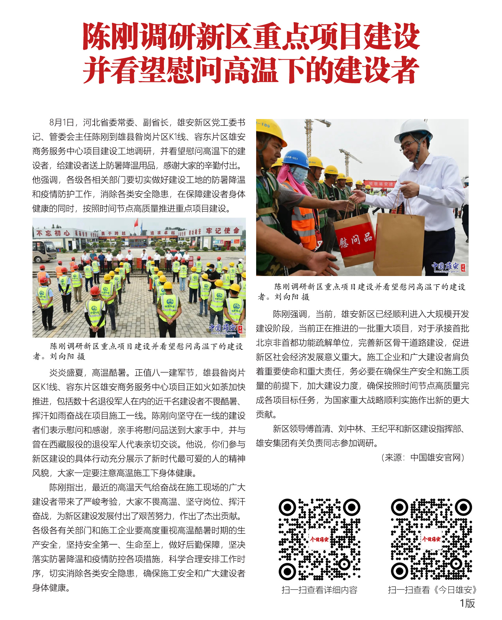 8月1日,陈刚到雄县昝岗片区K1线、容东片区雄安商务服务中心项目建设工地调研。