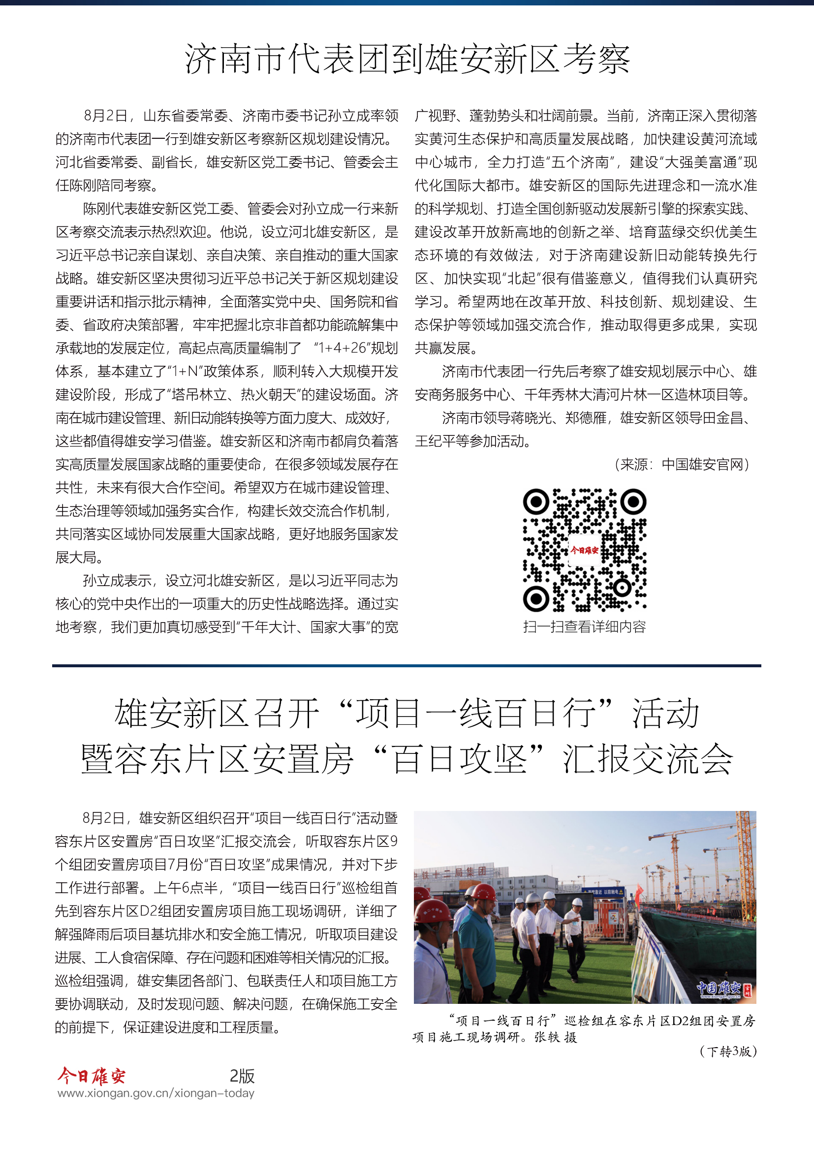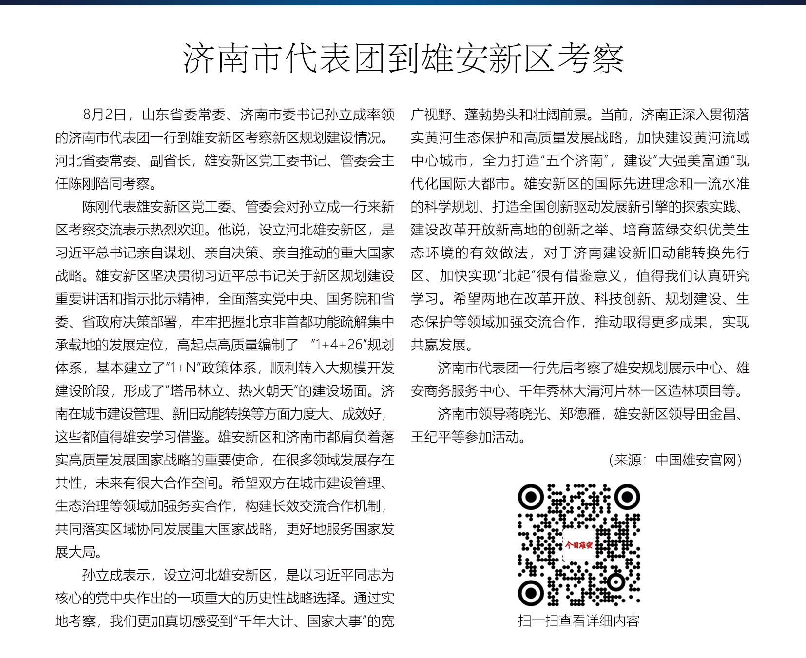 8月2日,山东省委常委、济南市委书记孙立成率领的济南市代表团一行到雄安新区考察新区规划建设情况。
