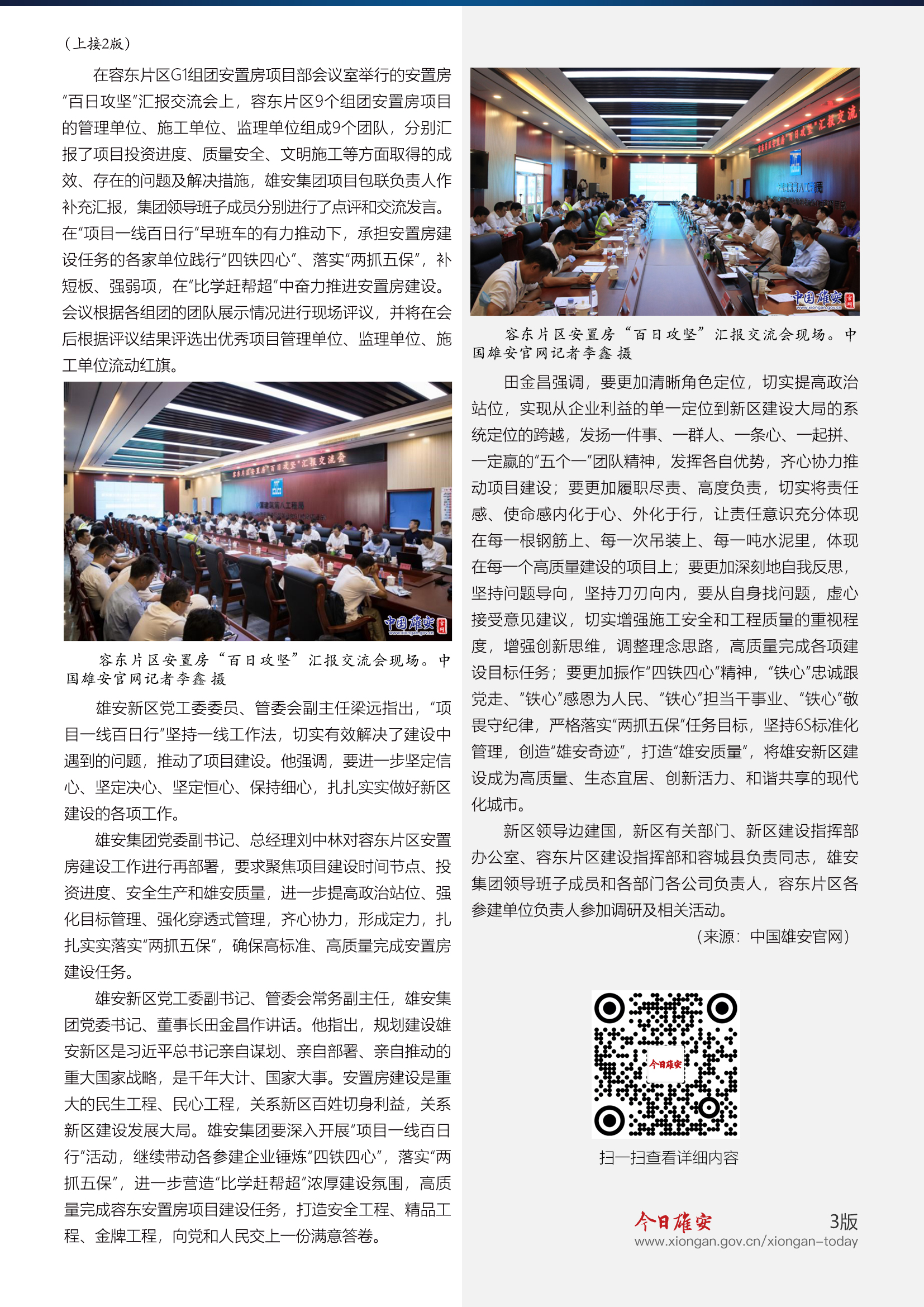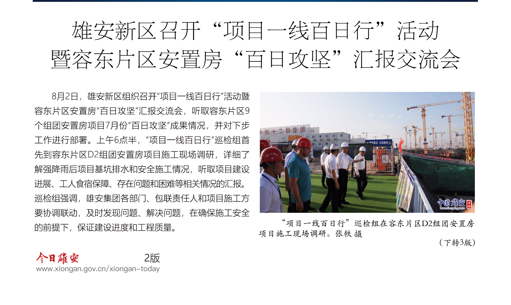 8月2日,雄安新区组织召开“项目一线百日行”活动暨容东片区安置房“百日攻坚”汇报交流会,听取容东片区9个组团安置房项目7月份“百日攻坚”成果情况,并对下步工作进行部署。