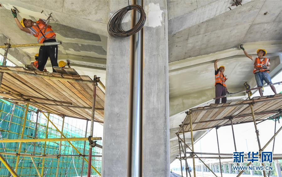 8月10日,工人在京雄城际铁路霸州北站建设工地为雨棚梁底抹腻子。京雄城际铁路霸州北站站台雨棚混凝土结构施工日前全部完成,目前霸州北站已全面转入装饰装修和机电安装阶段,预计2020年底投入使用。京雄城际铁路是连接北京市区、大兴机场和雄安新区的重要干线。建成后,将进一步完善京津冀区域高速铁路网结构,便利沿线群众出行,对于推动京津冀协同发展和支撑建设雄安新区具有重要意义。新华社记者李晓果 摄