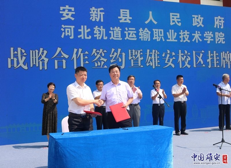 雄安新区安新县人民政府在安新县职教中心与河北轨道运输职业技术学院举行战略合作签约暨雄安校区挂牌仪式现场。中国雄安官网发