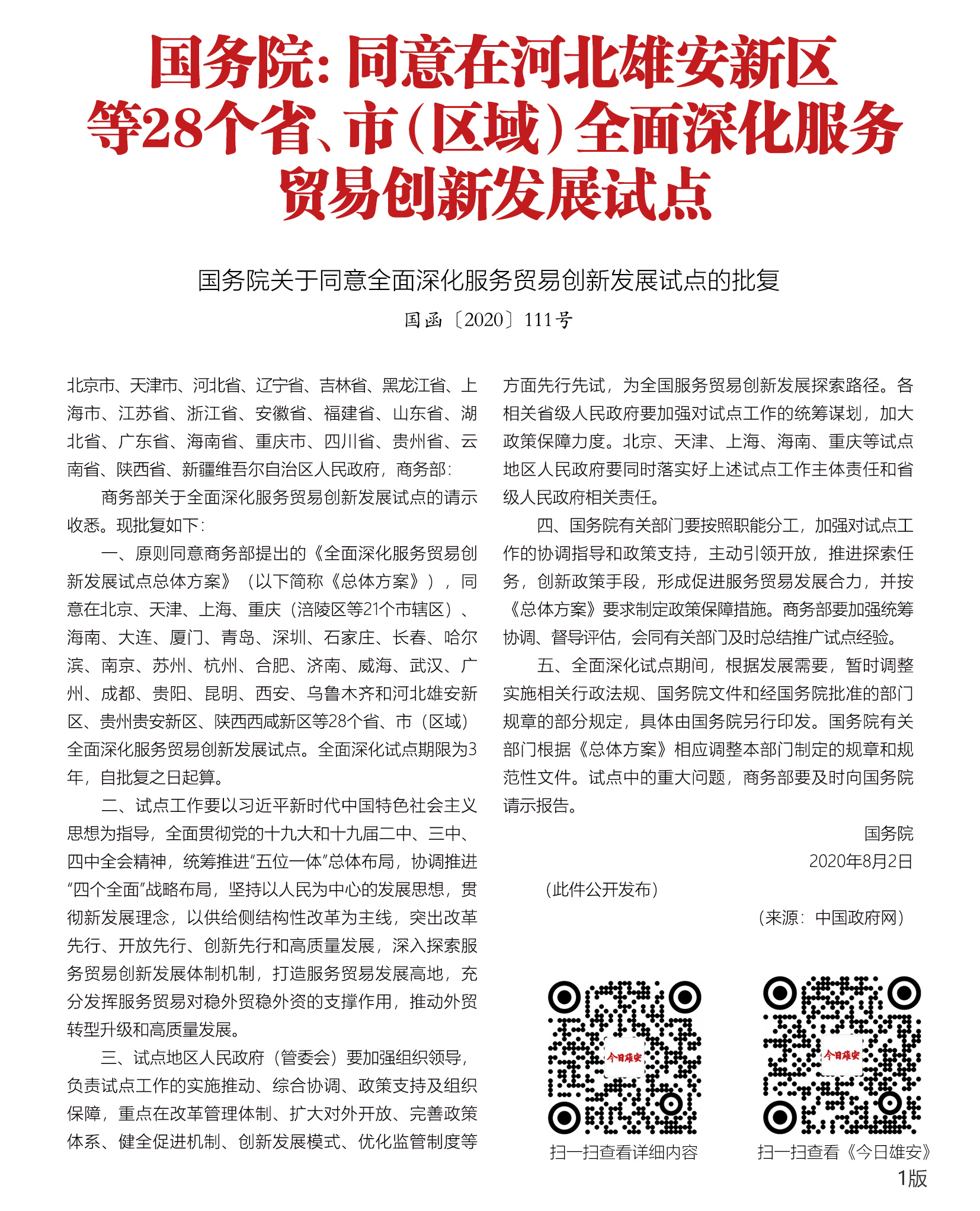 国务院关于同意全面深化服务贸易创新发展试点的批复