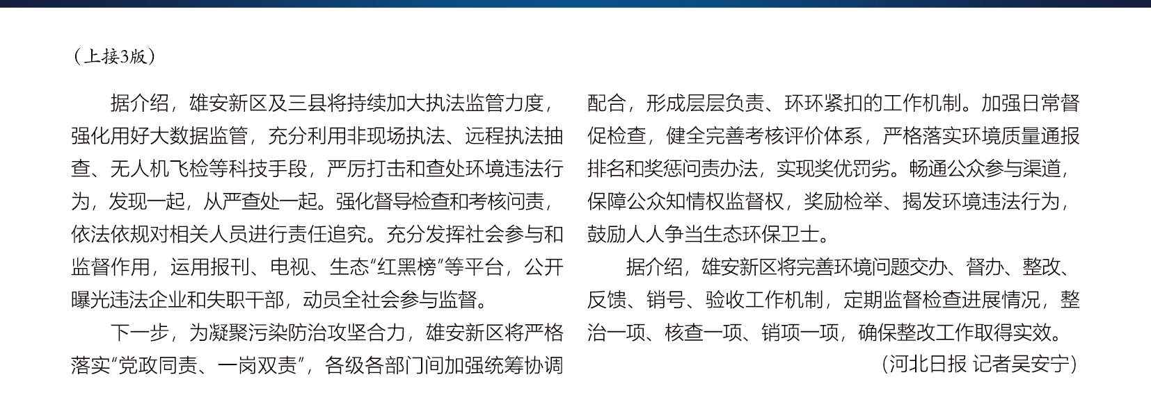 下一步,为凝聚污染防治攻坚合力,雄安新区将严格落实“党政同责、一岗双责”,各级各部门间加强统筹协调配合,形成层层负责、环环紧扣的工作机制。