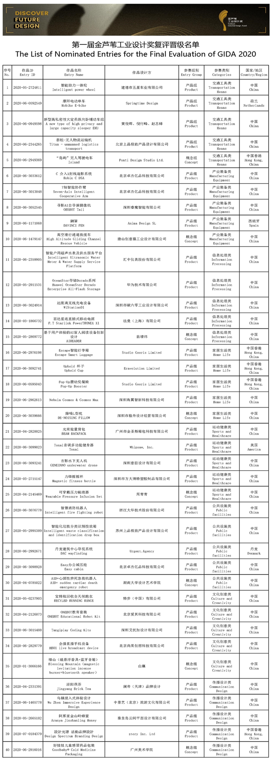 此次荣获金芦苇提名奖的107件作品来自中国、荷兰、日本、澳大利亚、土耳其、印度、斯洛文尼亚、中国香港、中国台湾等9个国家和地区,包括交通工具类19件、产业装备类20件、家居生活类48件、运动健康类1件、公共设施类8件、文化创意类1件、传播设计类10件。这些作品或在低碳、环保和可持续发展方面有着创新突破,或在文化传承与情感互动方面具有突出设计,或在引领未来设计发展方向、传达未来设计理念方面有着优秀表现,均对未来生活与产业发展具有一定启发意义。