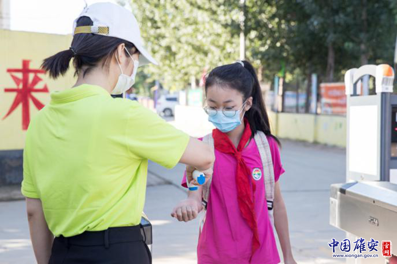 9月1日,中国人民大学附属小学雄安校区(沟西小学)学生入校前接受体温检测和登记。中国雄安官网记者李鑫 摄