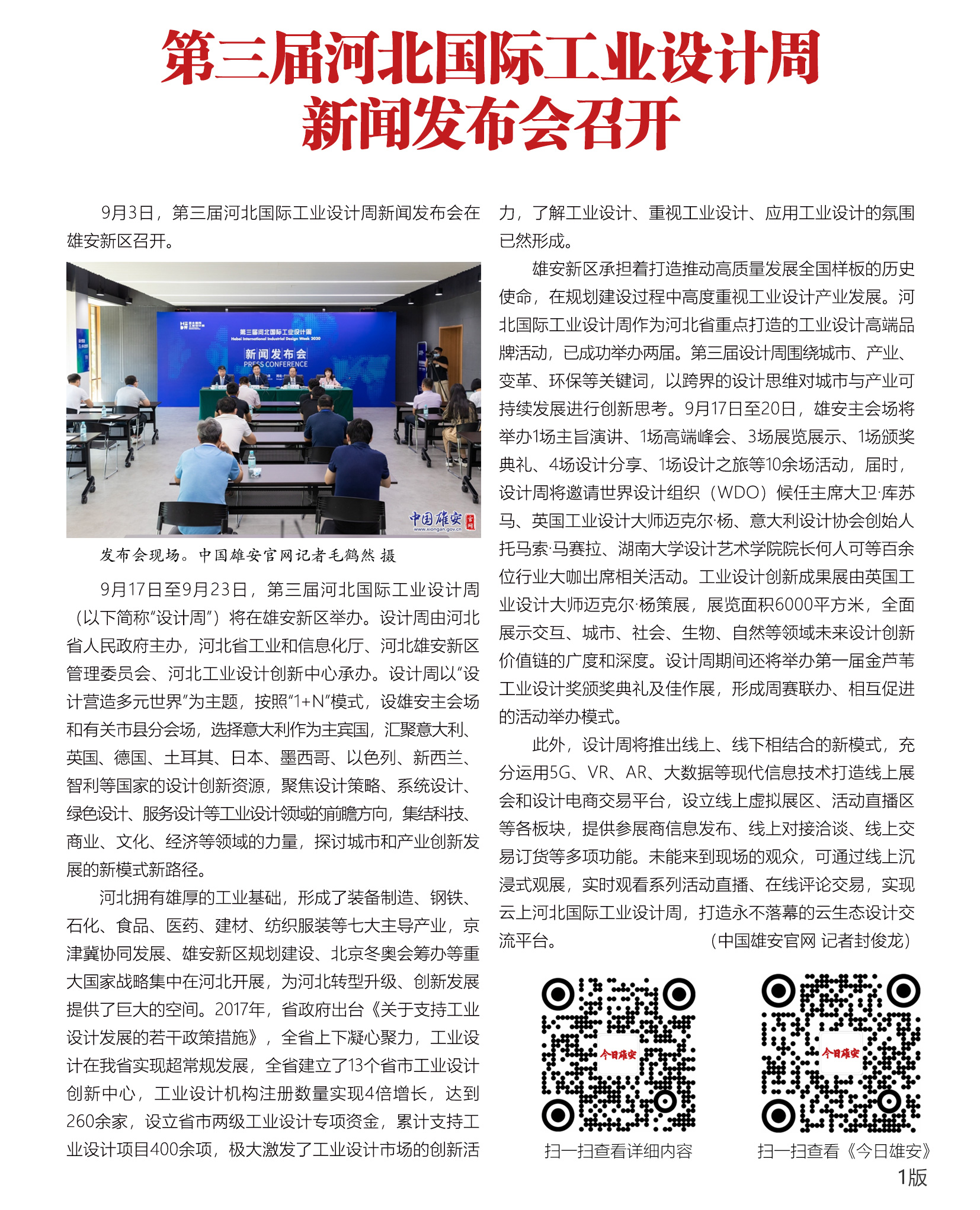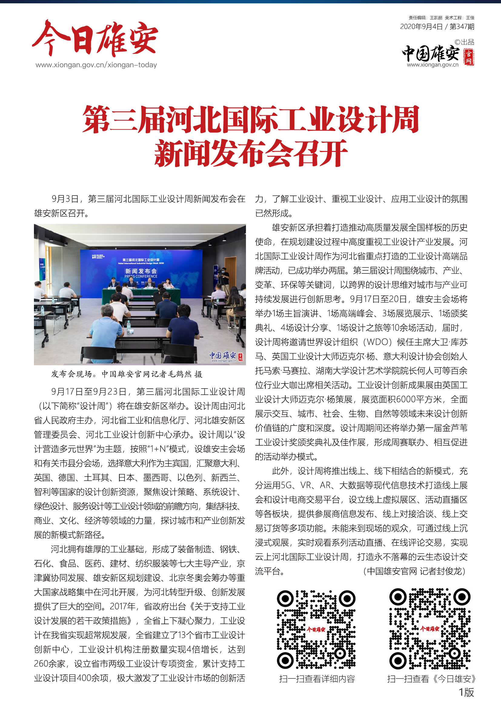 9月17日至9月23日,第三届河北国际工业设计周将在雄安新区举办。