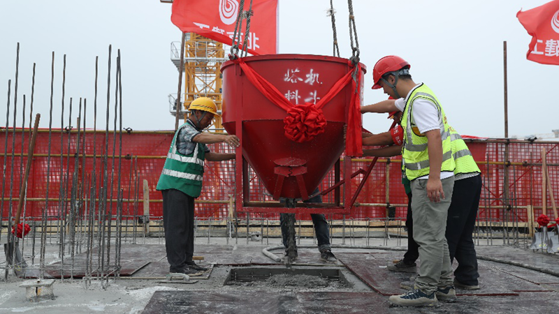 8月31日上午,随着塔吊将最后一方混凝土送上楼顶并浇筑成功,雄安新区容东片区B2组团安置房及配套设施项目施工总承包工程首栋楼主体结构封顶。