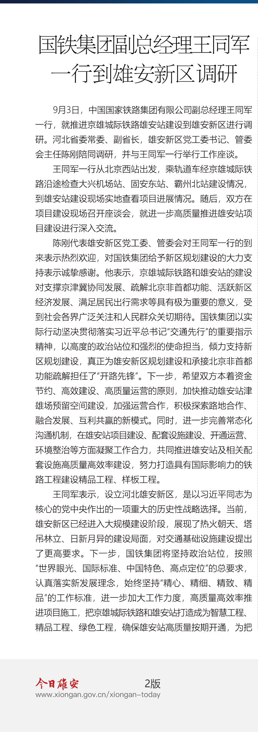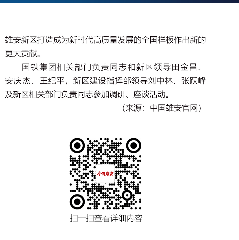 陈刚表示,希望双方本着资金节约、高效建设、高质量运营的原则,加快推动雄安站津雄场预留空间建设,加强运营合作,积极探索路地合作、融合发展、互利共赢的新模式。