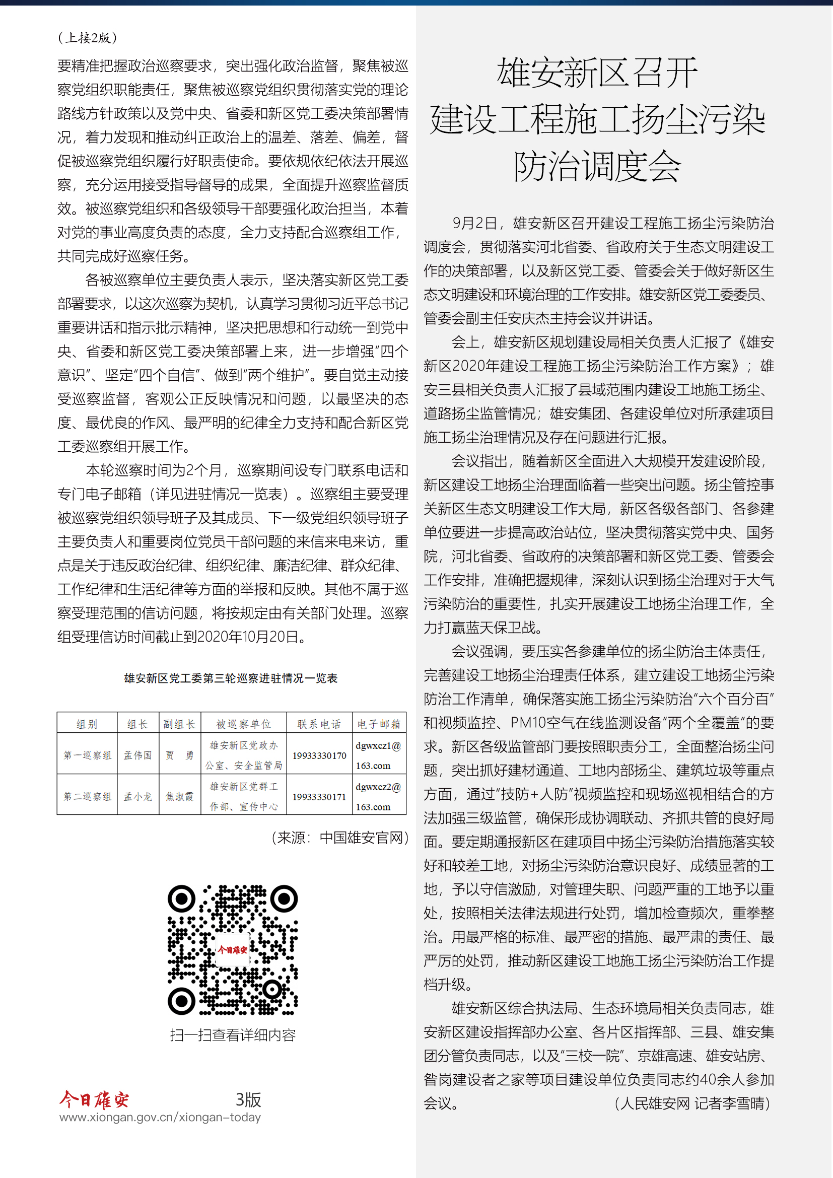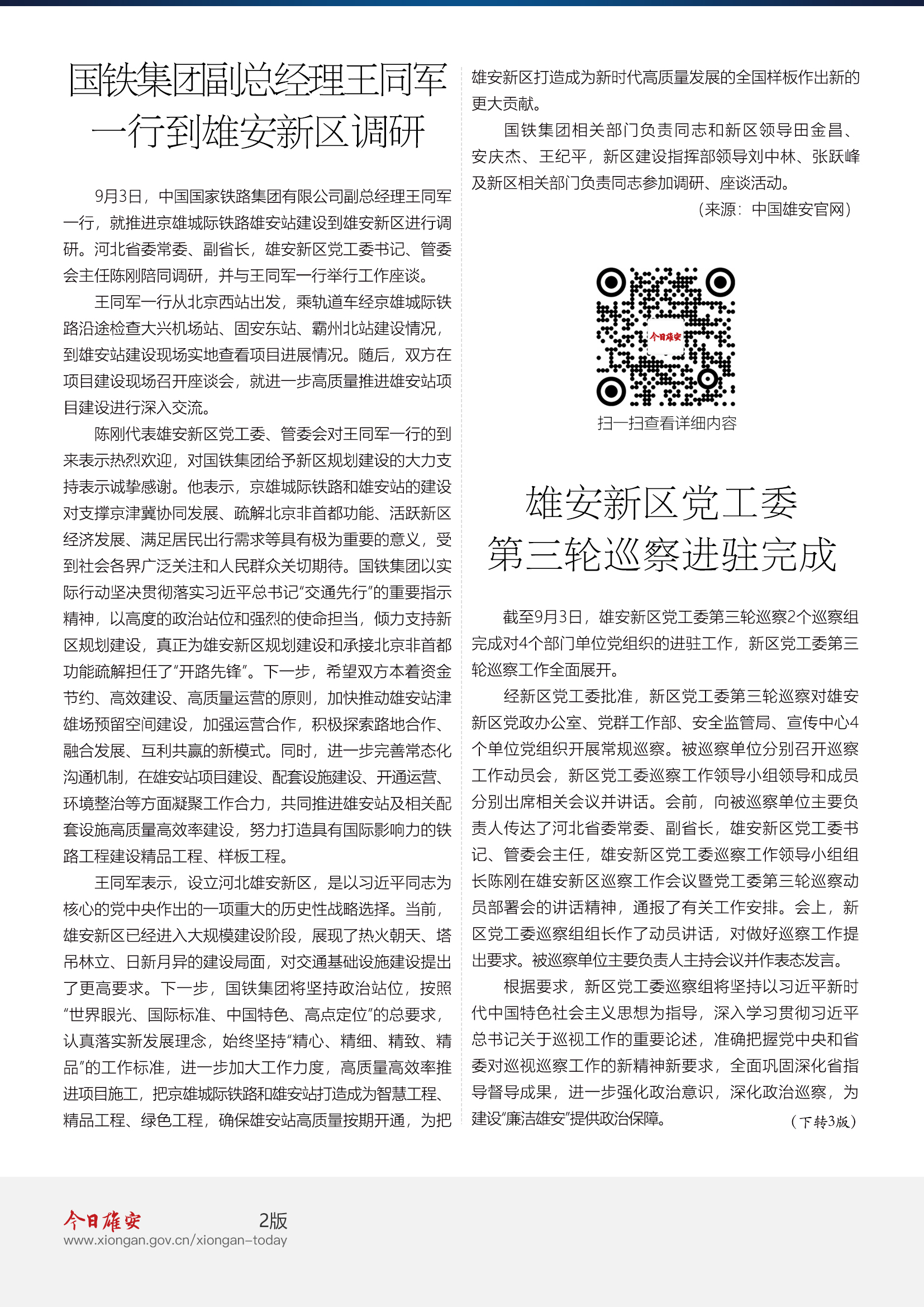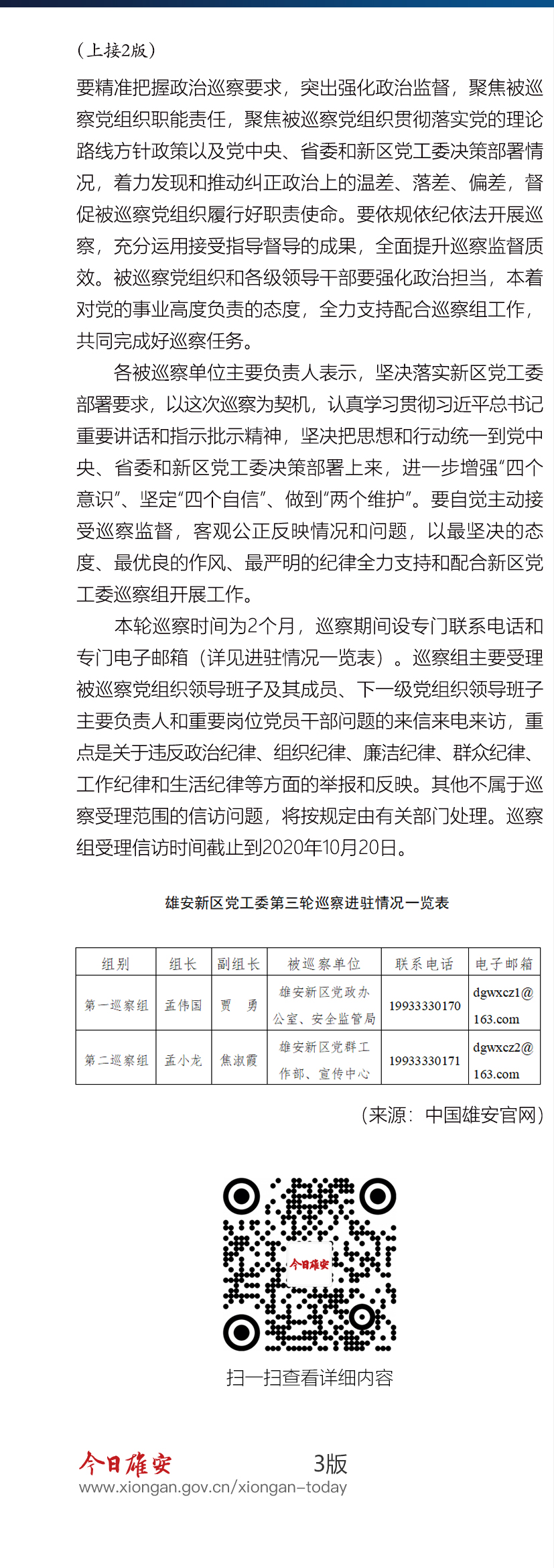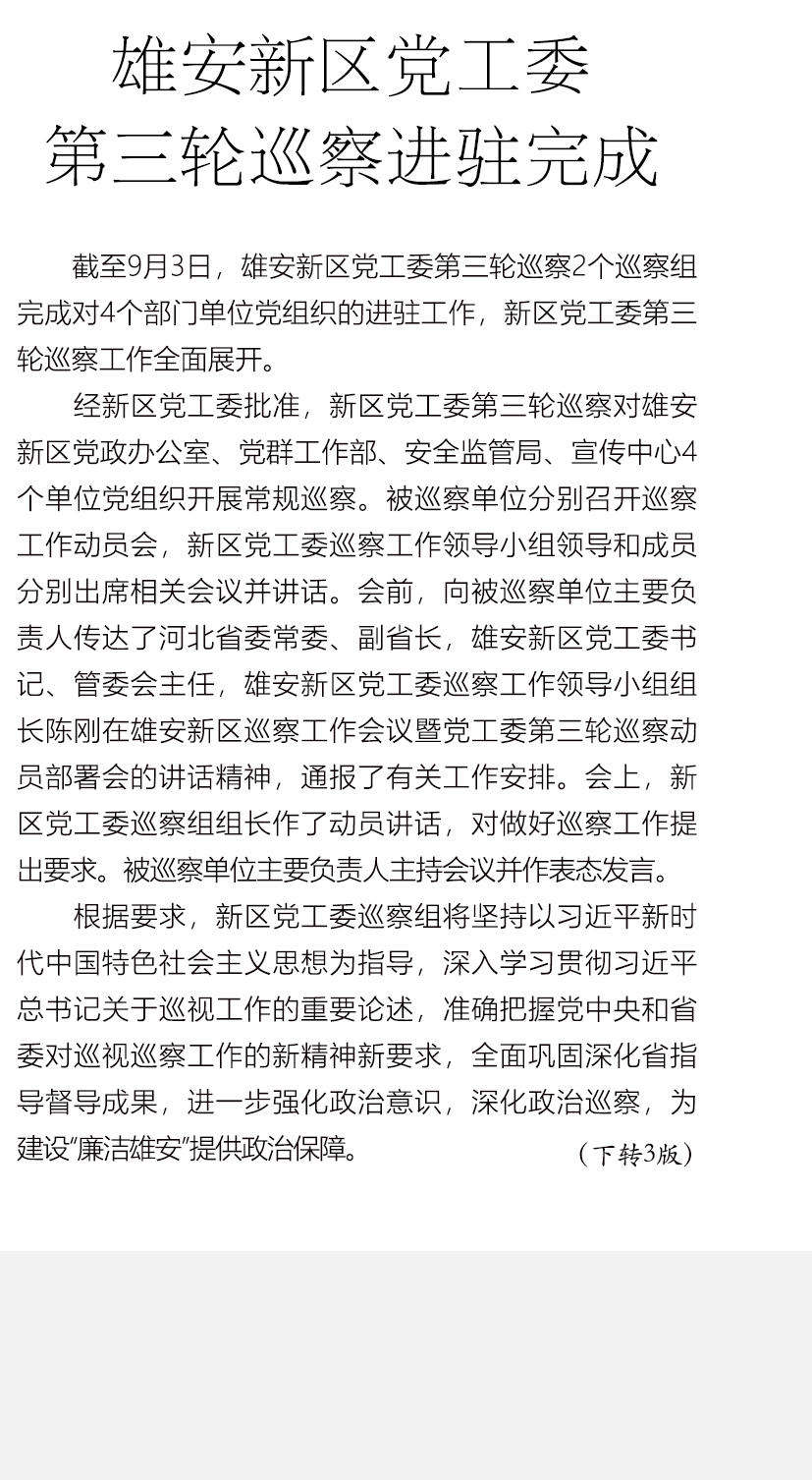 截至9月3日,雄安新区党工委第三轮巡察2个巡察组完成对4个部门单位党组织的进驻工作,新区党工委第三轮巡察工作全面展开。