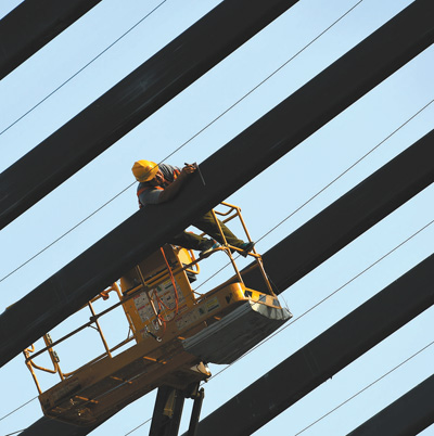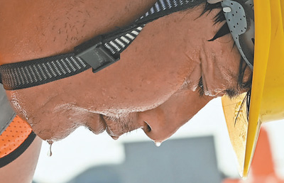 8月9日,中建三局一公司工人申宇州在进行雄安高铁站屋面工程作业。人民视觉