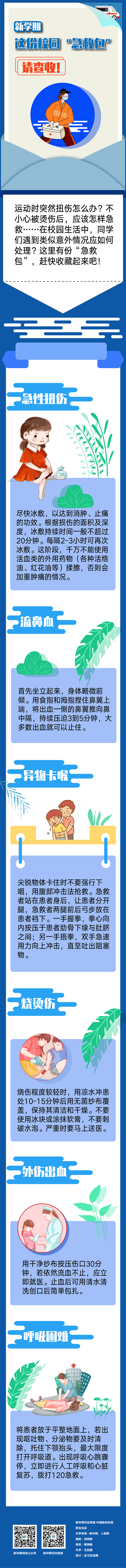 运动时突然扭伤怎么办?不小心被烫伤后,应该怎样急救?……在校园生活中,同学们遇到类似意外情况应如何处理?这里有份“急救包”,赶快收藏起来吧!