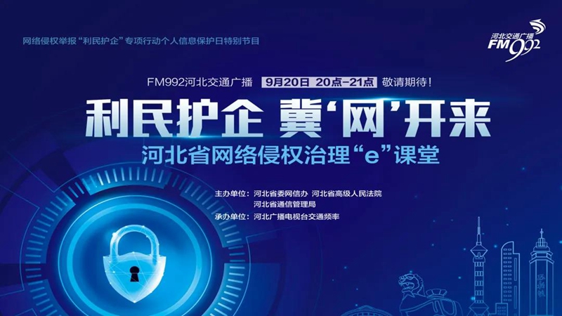2020年9月14日至9月20日,是第七个“国家网络安全宣传周”,为推动涉普通公民、民营企业、疫情防控的网络侵权信息举报受理处置工作,助力优化经济社会发展环境,河北交通广播与河北省委网信办、河北省通信管理局、河北省高级人民法院联袂策划推出网络侵权举报“利民护企”专项行动特别节目——“利民护企、冀‘网’开来”河北省网络侵权治理“e”课堂。
