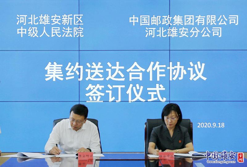 中国雄安官网9月22日电 9月18日下午,河北雄安新区中级人民法院(以下简称“雄安中院”)与中国邮政集团有限公司河北雄安分公司(以下简称“雄安邮政”)签订了集约送达合作协议。河北雄安新区中级人民法院党组成员、副院长张晓梅,中国邮政集团有限公司河北雄安分公司总经理景屹出席签订仪式。