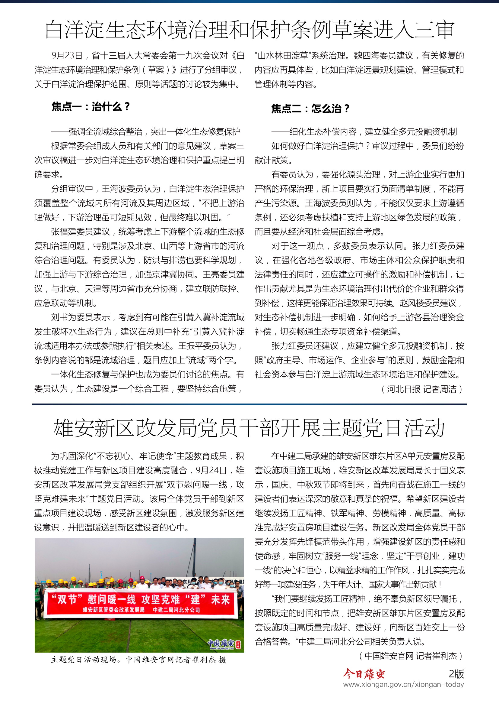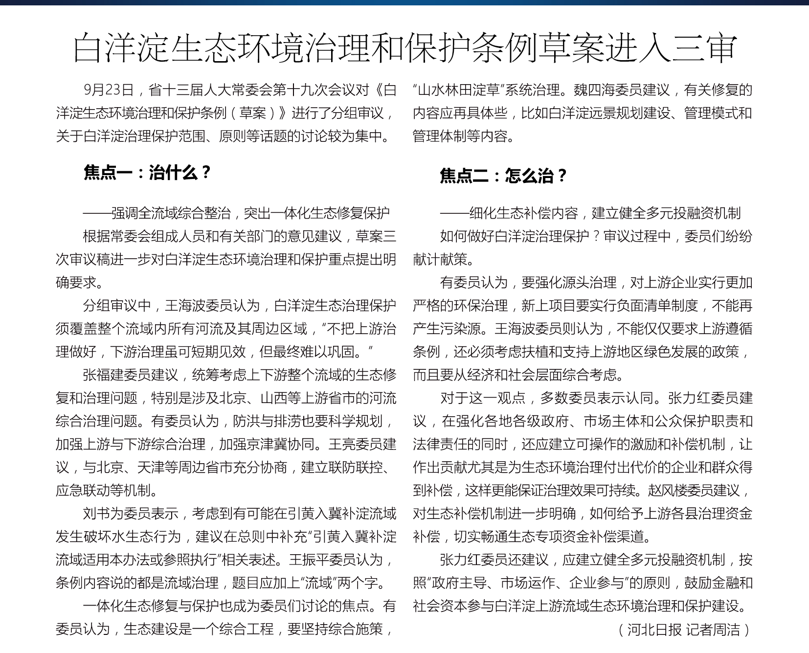 9月23日,河北省十三届人大常委会第十九次会议对《白洋淀生态环境治理和保护条例(草案)》进行了分组审议,关于白洋淀治理保护范围、原则等话题的讨论较为集中。