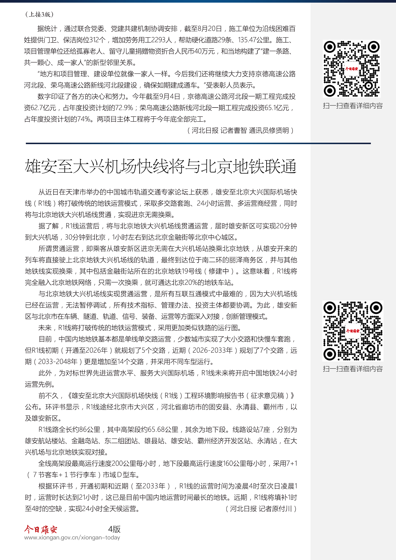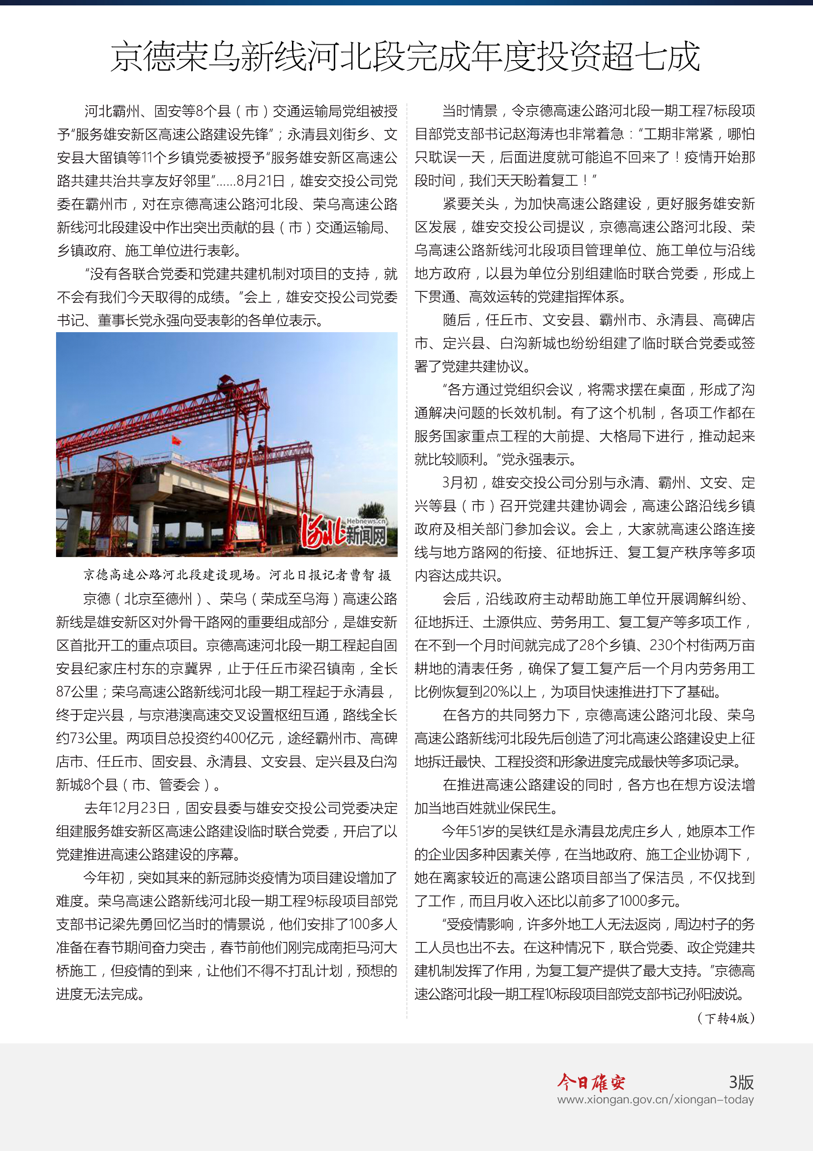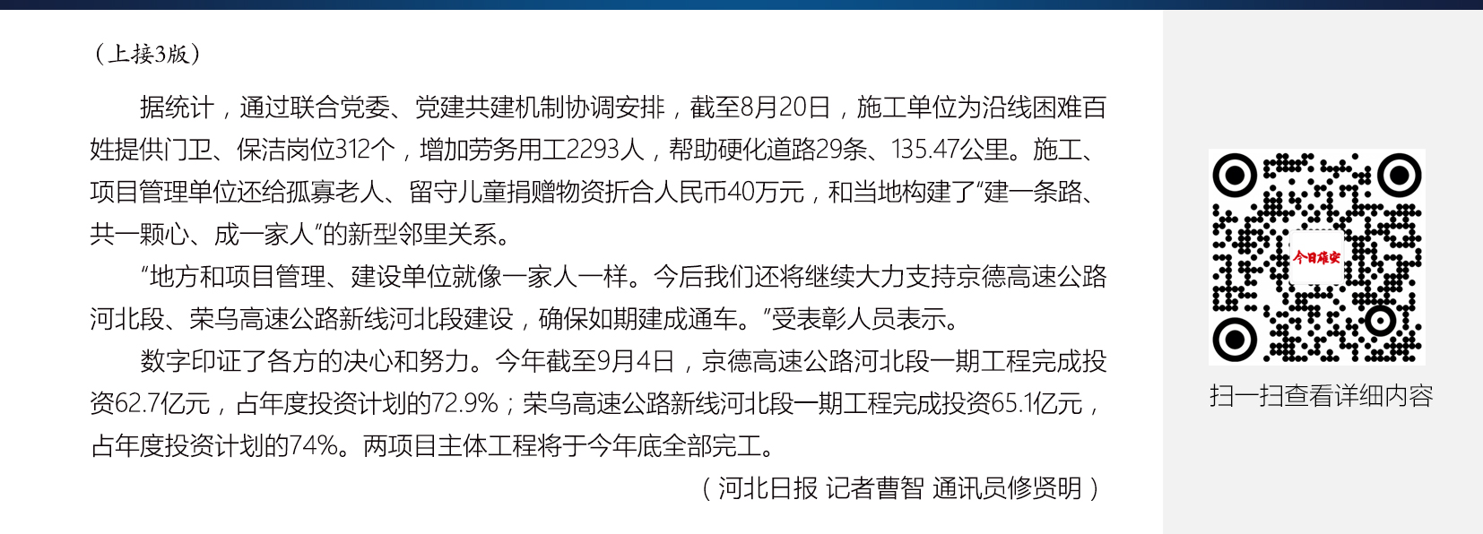 今年截至9月4日,京德高速公路河北段一期工程完成投资62.7亿元,占年度投资计划的72.9%;荣乌高速公路新线河北段一期工程完成投资65.1亿元,占年度投资计划的74%。