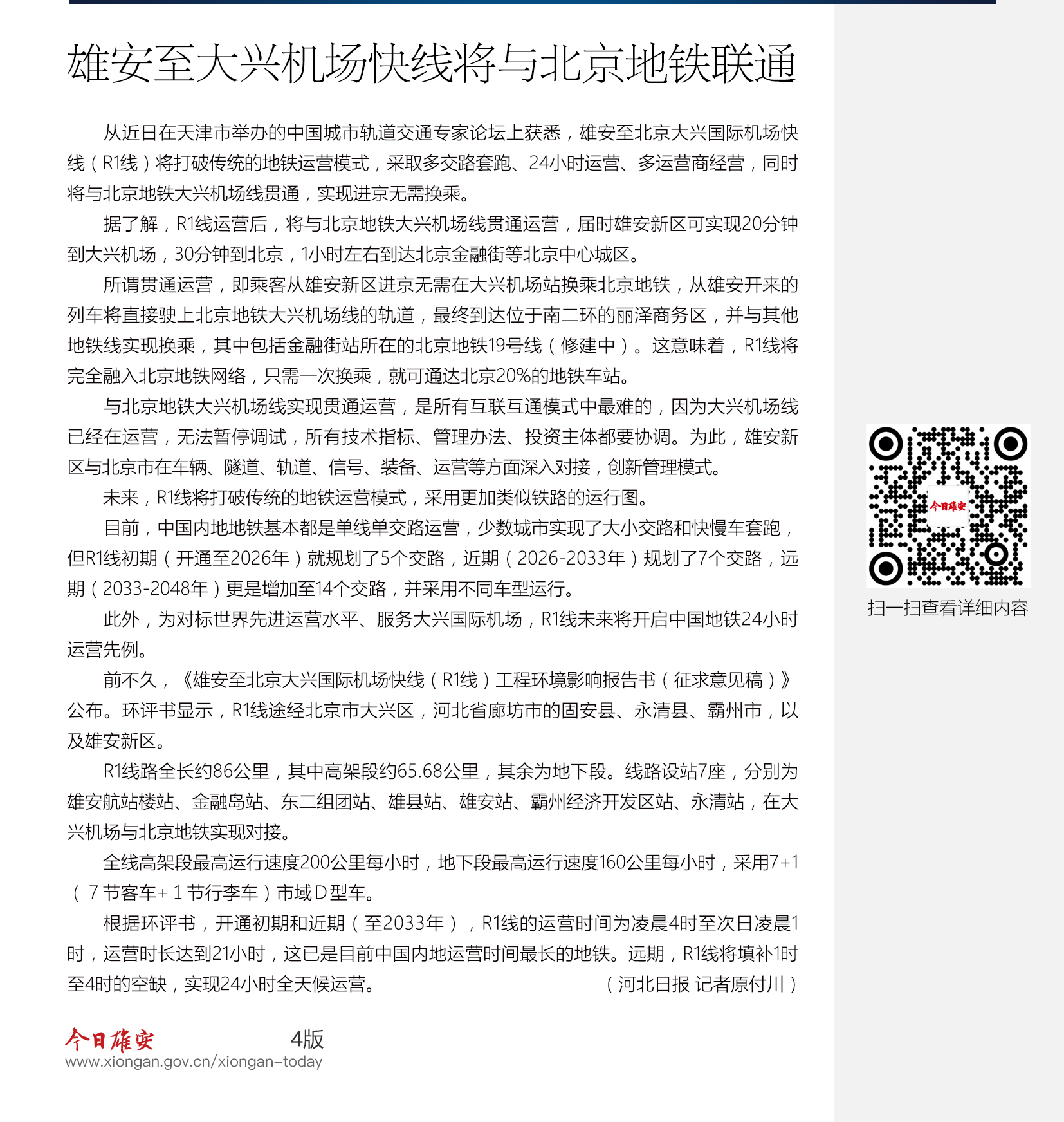 雄安至北京大兴国际机场快线(R1线)将打破传统的地铁运营模式,采取多交路套跑、24小时运营、多运营商经营,同时将与北京地铁大兴机场线贯通,实现进京无需换乘。