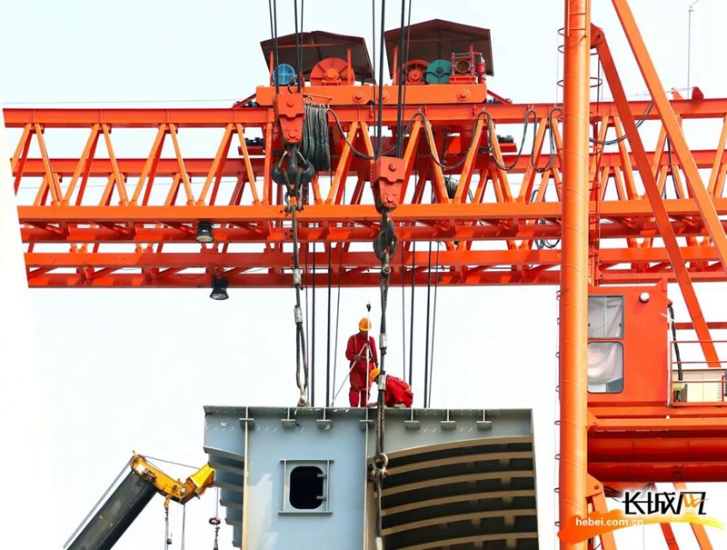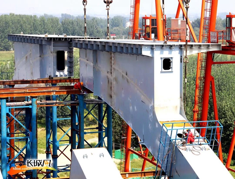 京雄高速施工人员进行钢拱箱梁就位安装作业。
