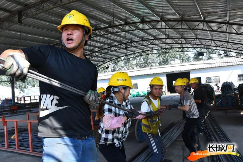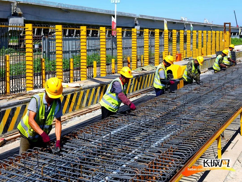 京雄高速施工人员进行T梁顶板钢筋绑扎作业。