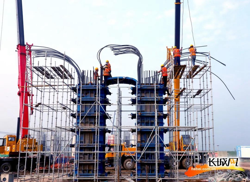 京雄高速施工人员进行桥梁花瓶墩的钢筋绑扎。