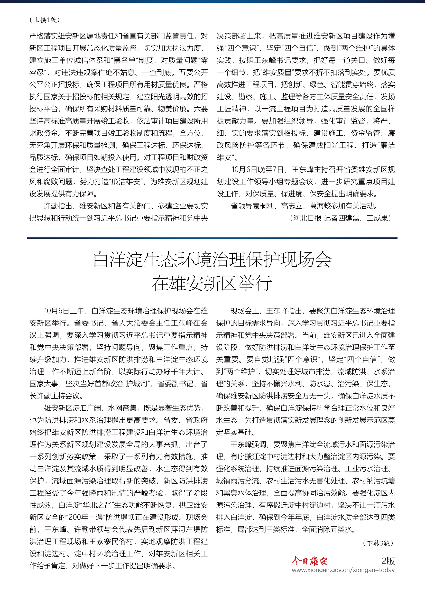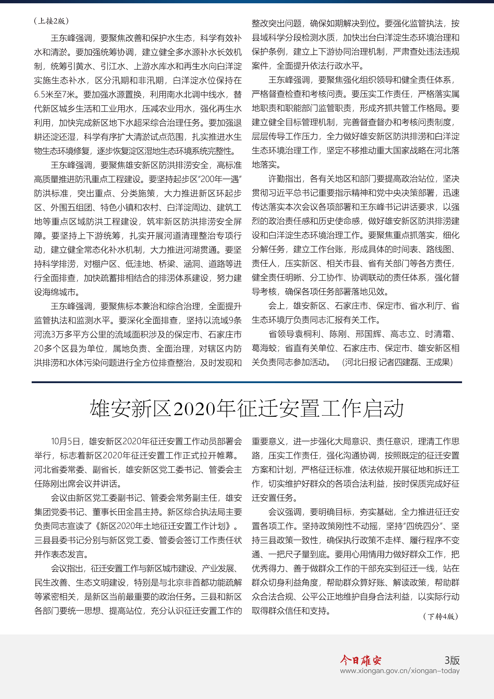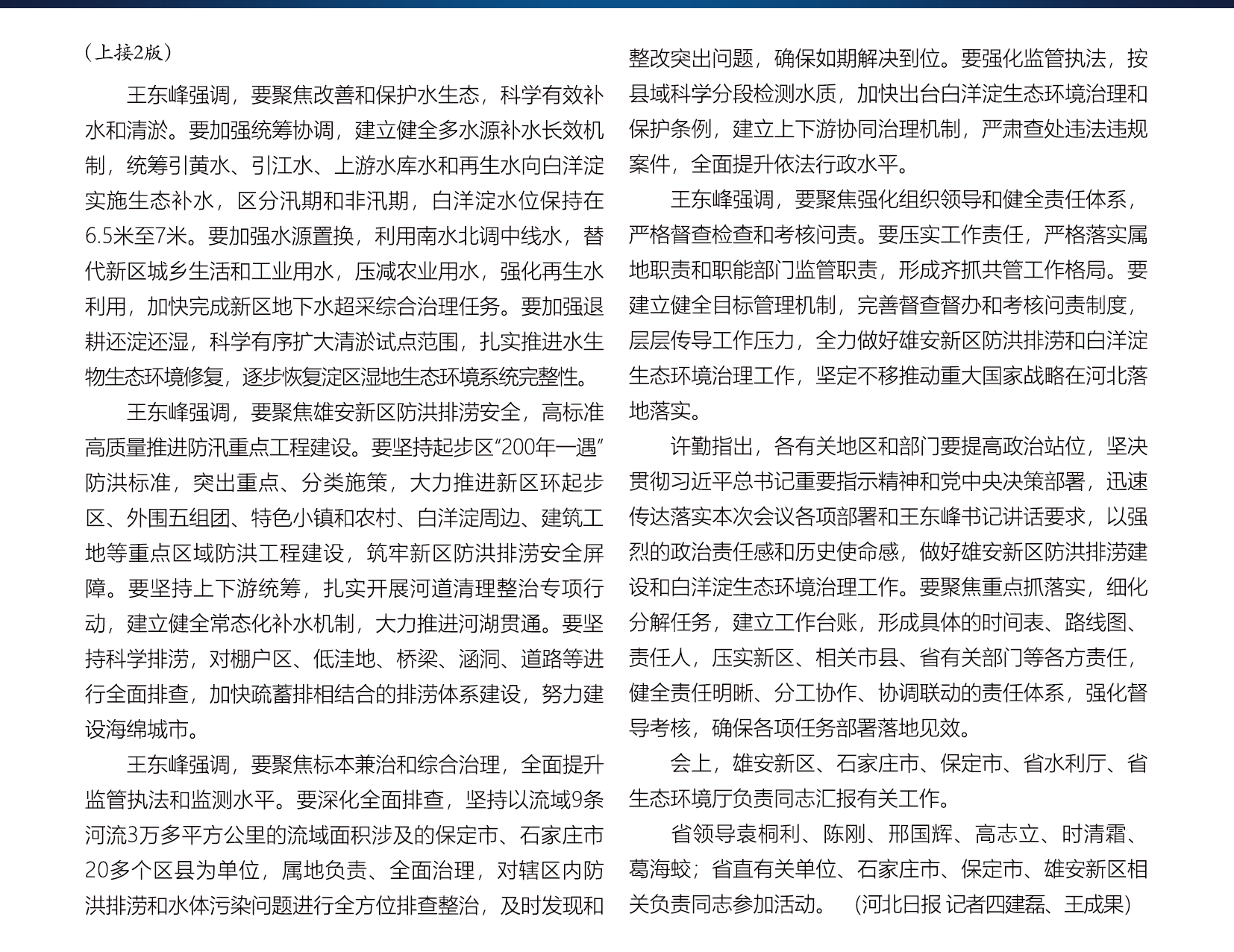 全力做好雄安新区防洪排涝和白洋淀生态环境治理工作。