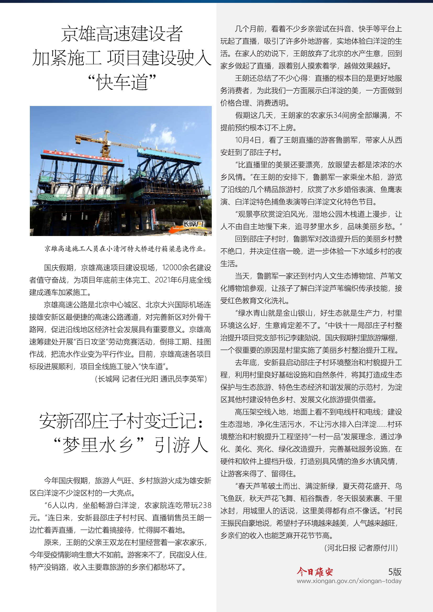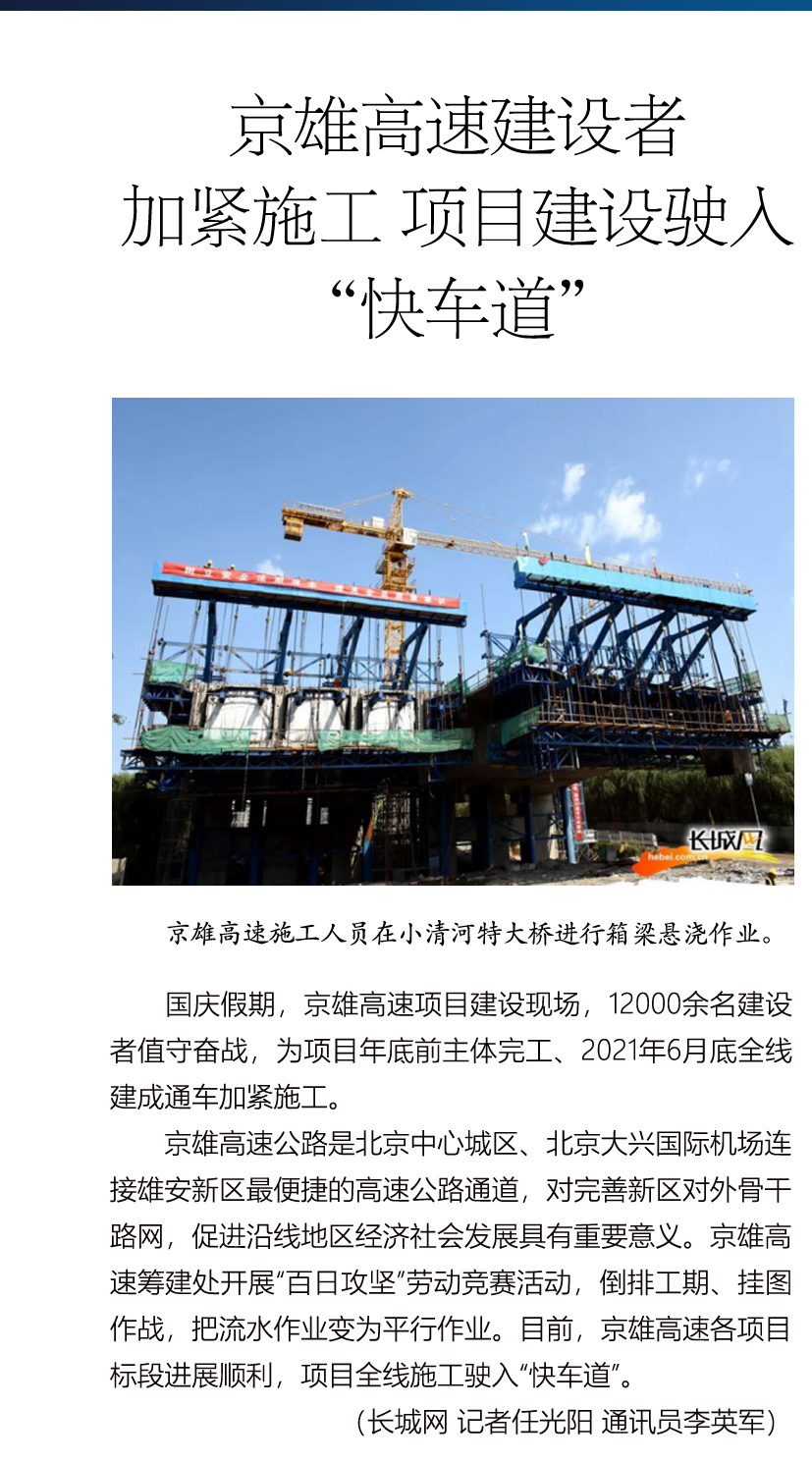 国庆假期,京雄高速项目建设现场,12000余名建设者值守奋战,为项目年底前主体完工、2021年6月底全线建成通车加紧施工。