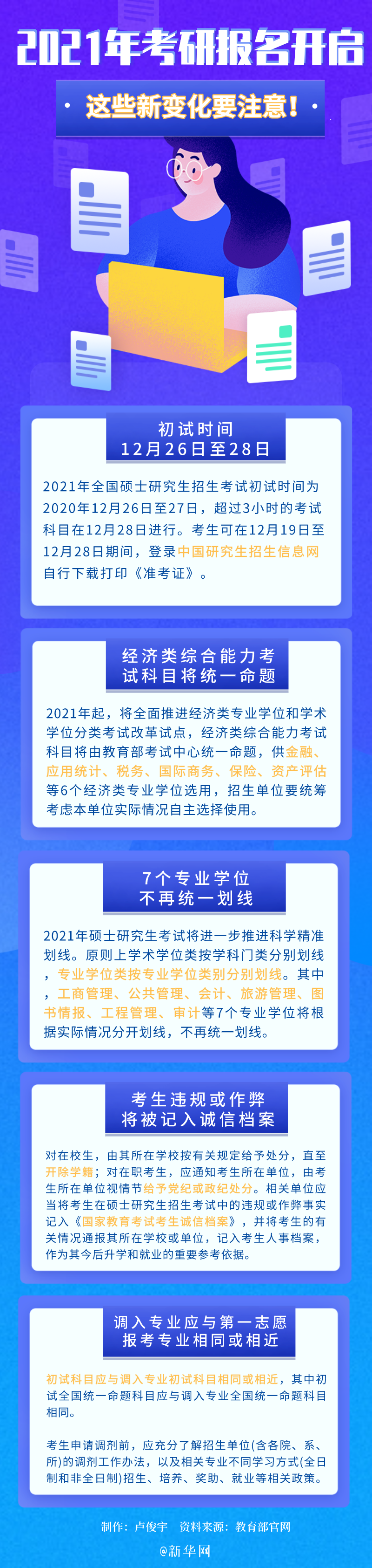 10月10日起至10月31日,全国硕士研究生招生考试开始正式报名,每天9:00-22:00,考生可登录网上报名平台填报报名信息。2021年研究生招生考试在考试命题、调剂、专业划线等方面都有所调整,一图带你速览这些方面的变化。