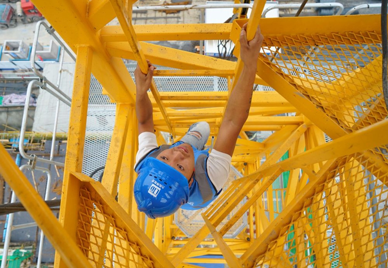9月24日,阿洛春梅结束工作,走下塔吊。新华每日电讯记者邢广利 摄