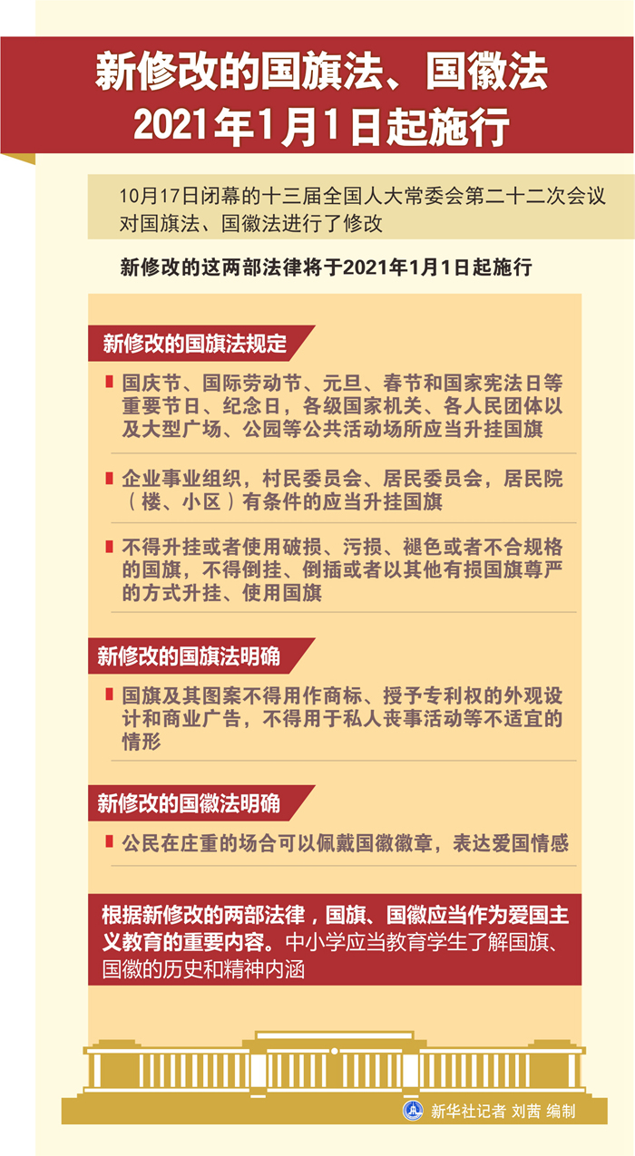 新华社北京10月17日电(记者丁小溪)17日闭幕的十三届全国人大常委会第二十二次会议对国旗法、国徽法进行了修改。新修改的这两部法律将于2021年1月1日起施行。