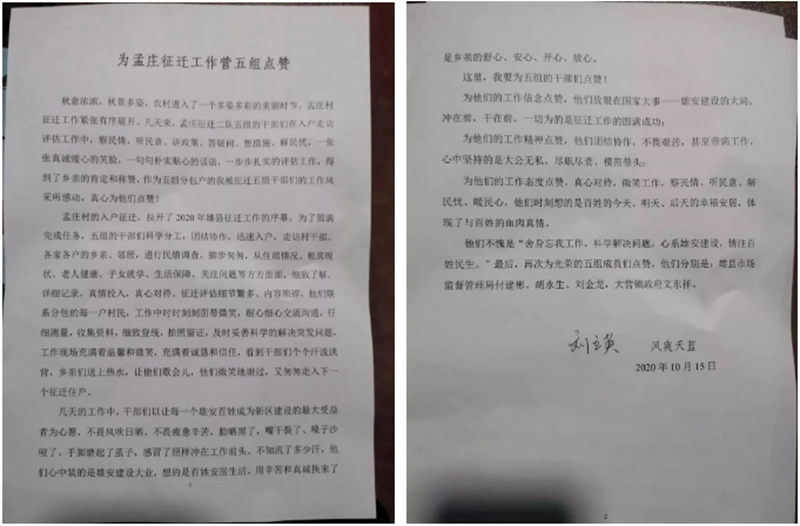 “从征迁工作组入驻后,我亲眼看到他们真的是没有休息过。白天到各户了解情况,回到工作营还要汇总各项数据。而且,只要是我们有需要,他们就一直陪着,耐心为我们解释政策。”刘立英说,写感谢信就是想表达自己的敬意,正是他们的责任担当、奉献精神感染了我们,打动了我们征迁户的心。